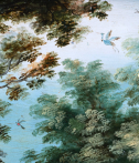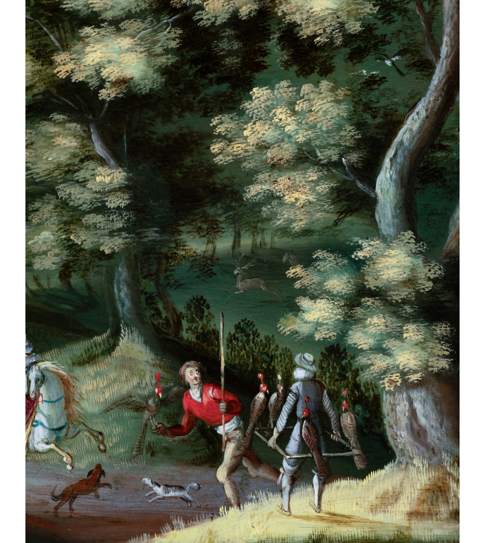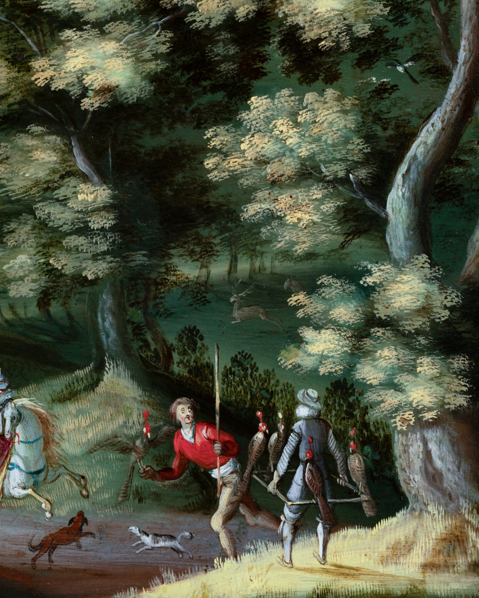 Our painting illustrates a falcon hunt taking place in an undergrowth dominated by tall trees with dense foliage.