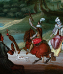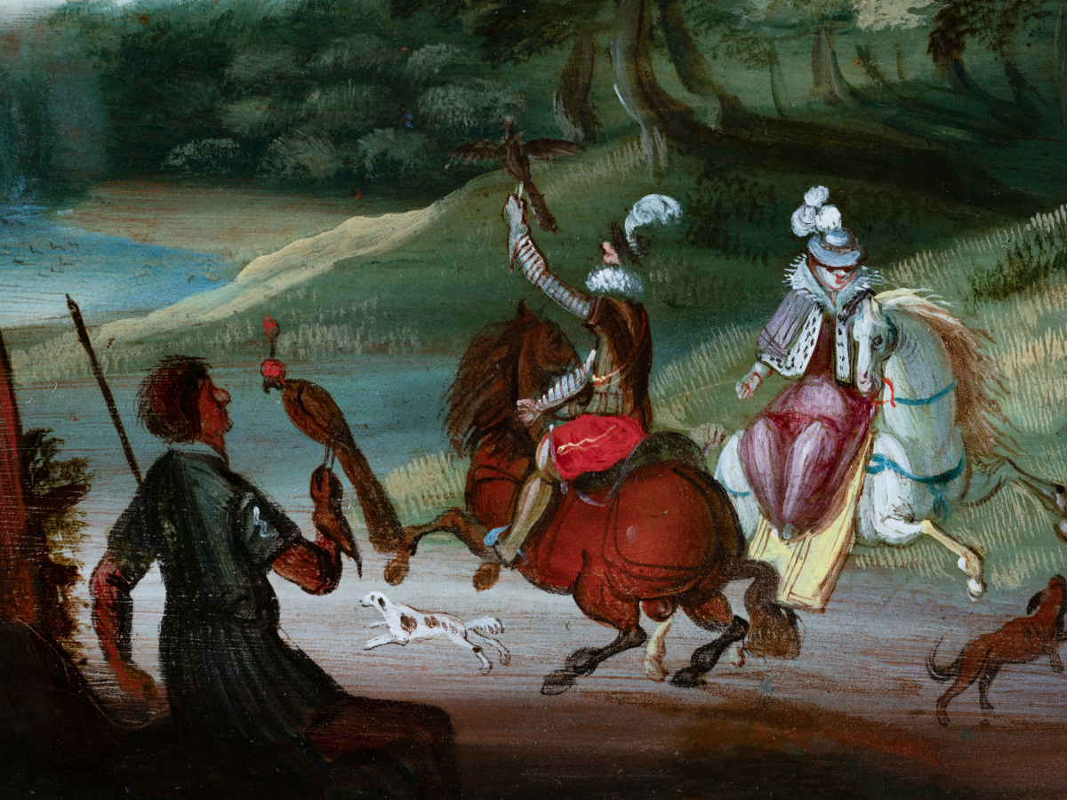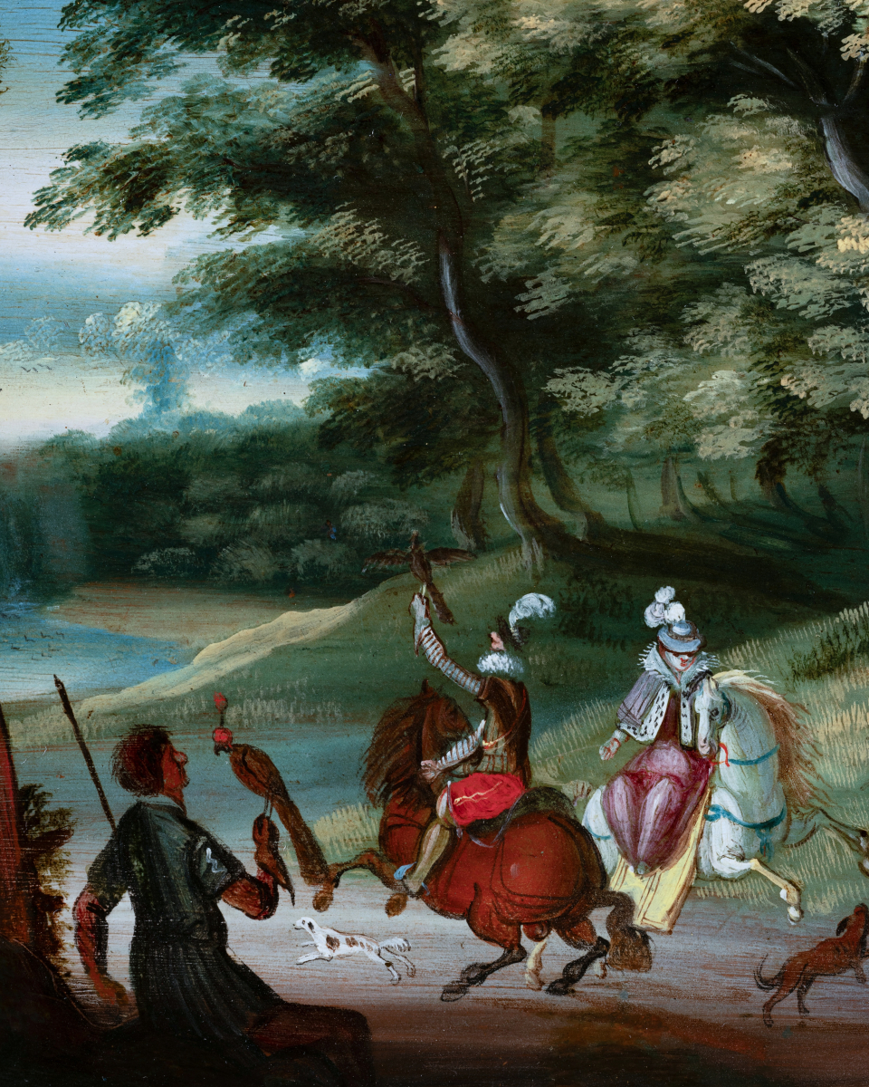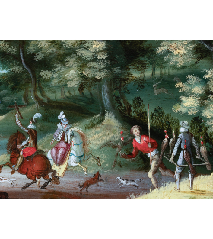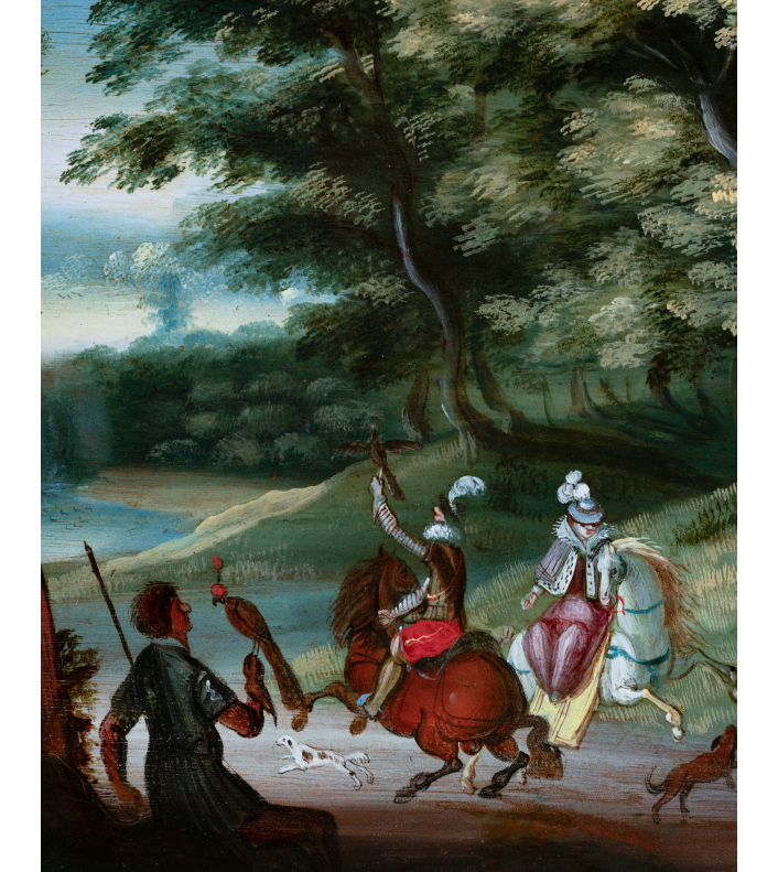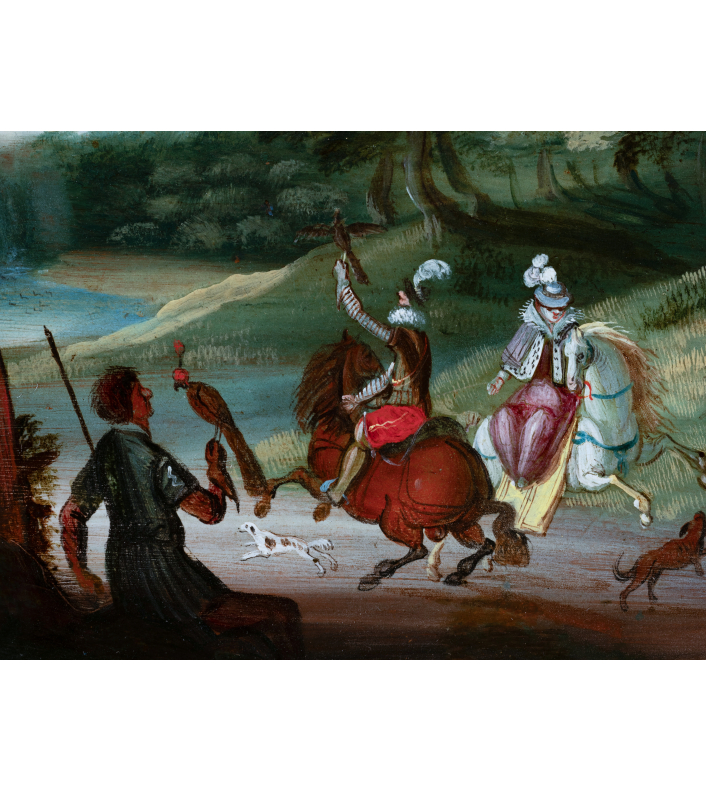The scene is very lively and is mainly read in the foreground: a pair of aristocrats mounted on horseback, wearing feather hats and sumptuously dressed, participate in the falcon hunt accompanied by their servants.