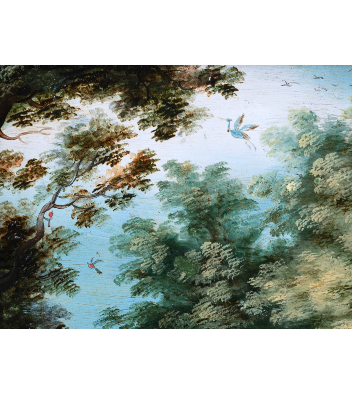 The composition of our forest landscape with lush vegetation directs us towards the Frankenthal school and more particularly the painter Anton Mirou. Greatly influenced by Gillis Van Coninxloo (1544-1607), leader of the Frankenthal school, the artist frequently indulges in the new technique, which emerged in the 1600s consisting of using close-ups, focusing more on the woods and trees in the foreground, reducing the space devoted to the sky and extending to three-quarters of the composition the space occupied by the trees.