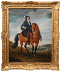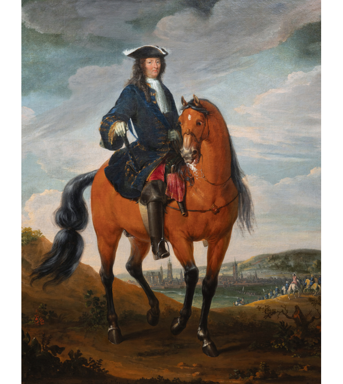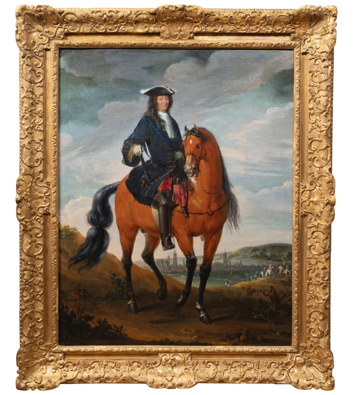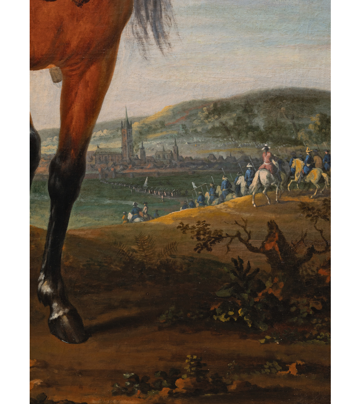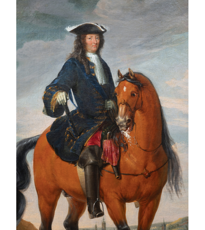 Adhering to the conventions of warlike iconography, our portrait depicts the monarch as an accomplished horseman before the besieged city of Mons.