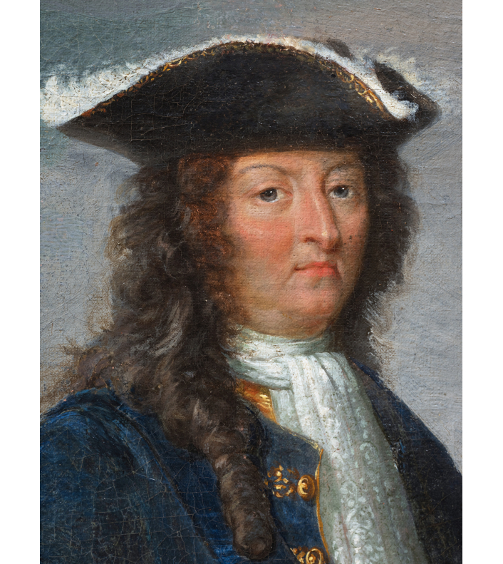 Simply dressed in court attire—a blue velvet doublet embroidered with gold, a white lace cravat, a black hat with a white plume, and modest black boots—his outfit bears no royal insignia. The sole accessory of his status, his fleur-de-lis-adorned baton of command, rests in his right hand against his thigh.