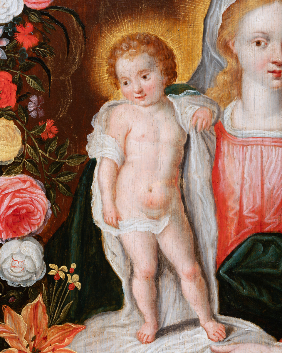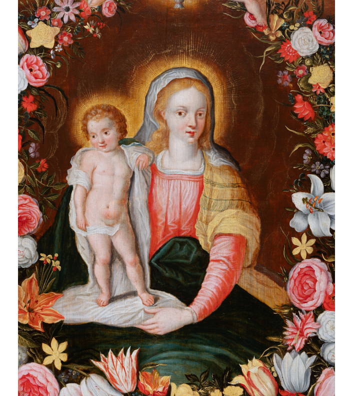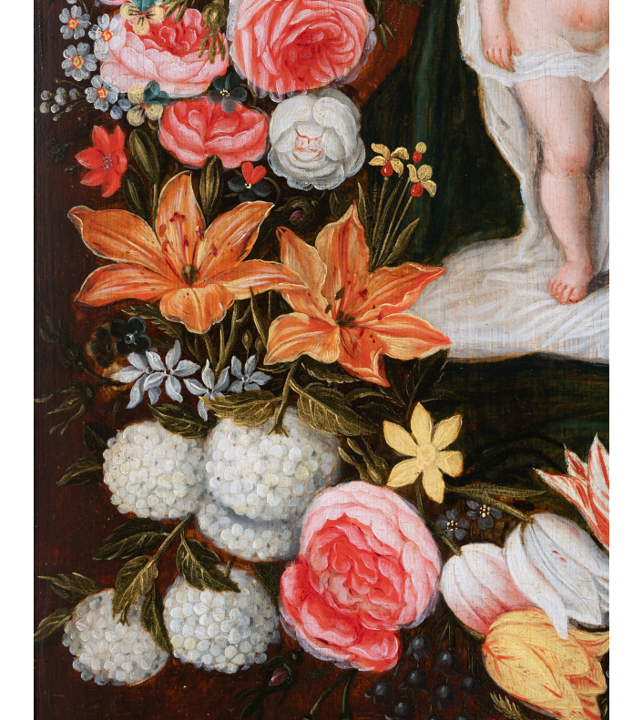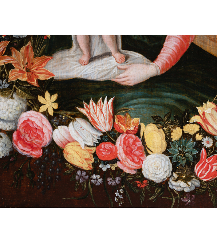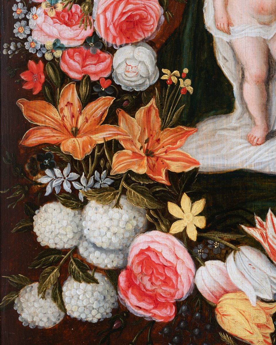 Both divine and secular, the image of the Virgin surrounded by a garland of flowers is part of a cultural and religious context of the early 17th century in the Low Countries. The veneration of the Virgin Mary in a domestic setting is associated with the Flemish and Dutch passion for flowers and new discoveries in this field.