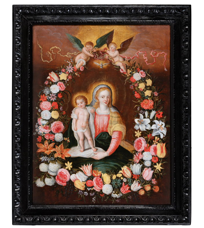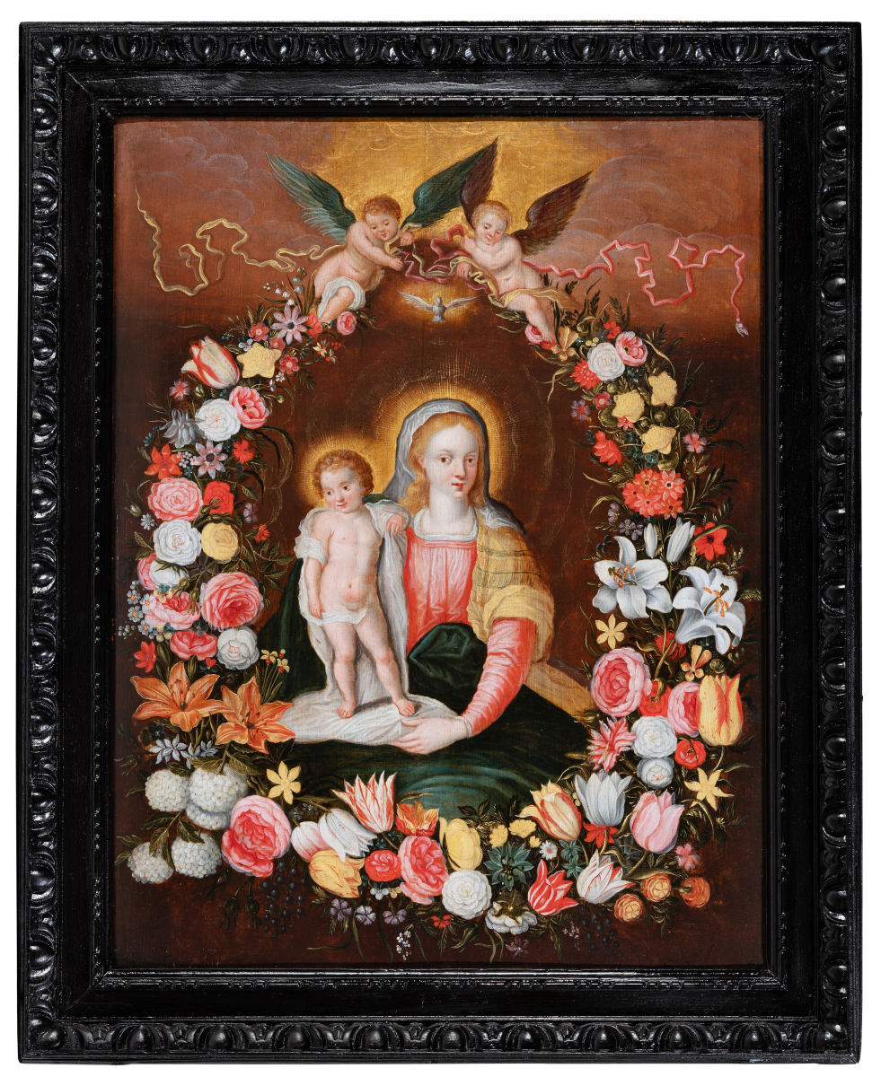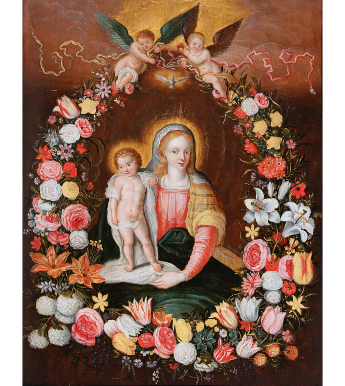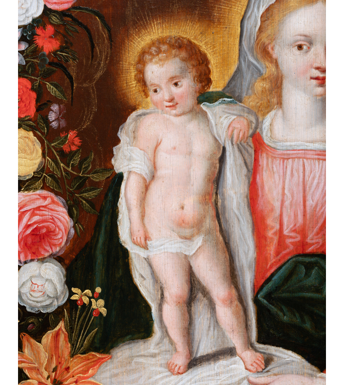 Both divine and secular, the image of the Virgin surrounded by a garland of flowers is part of a cultural and religious context of the early 17th century in the Low Countries. The veneration of the Virgin Mary in a domestic setting is associated with the Flemish and Dutch passion for flowers and new discoveries in this field.