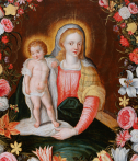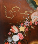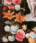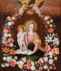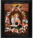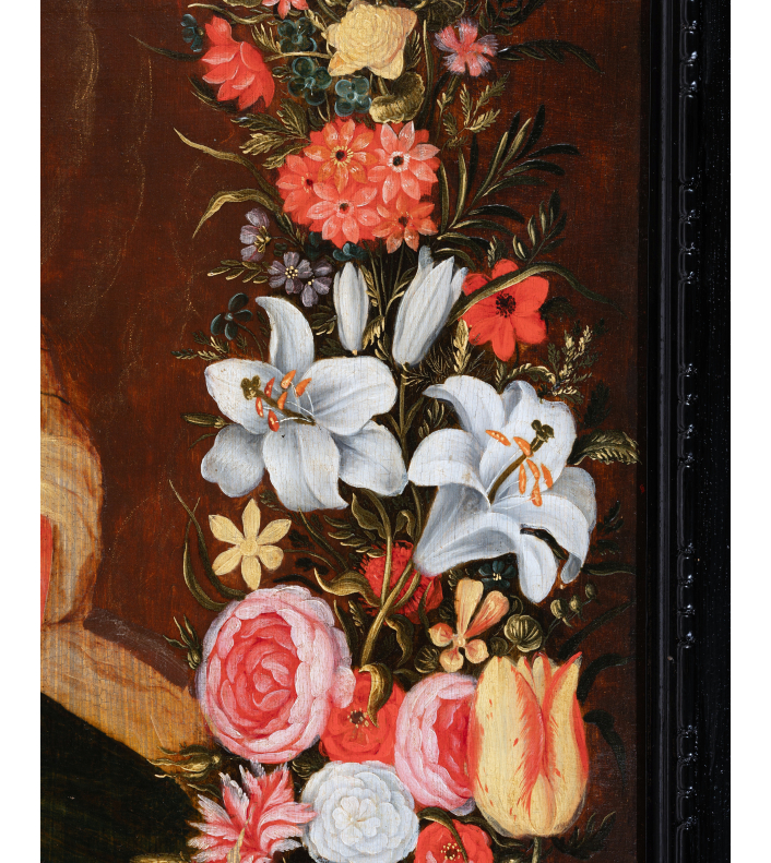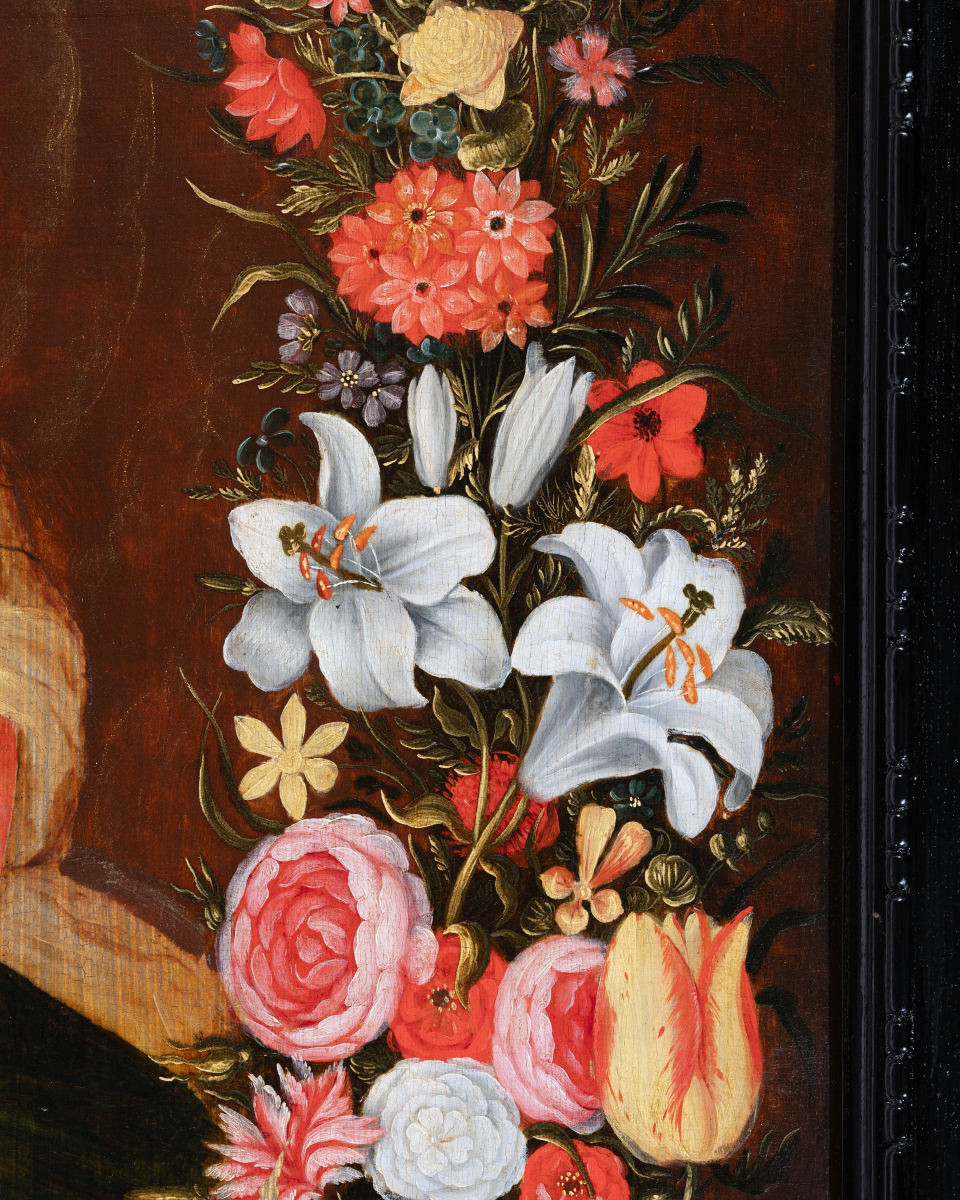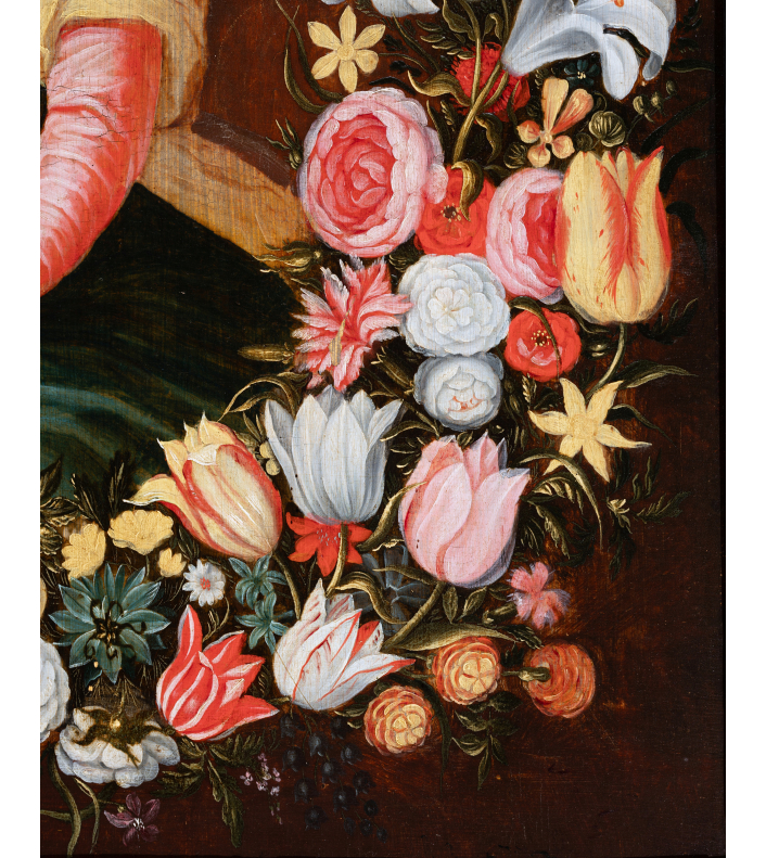 This type of composition, energized by Jan Brueghel the Elder (1568-1625), is a kind of pictorial assemblage often executed by two artists: one for the garland and the other for the central figures. Generally, the medallion depicts a devotional image of a saint or the Virgin and Jesus. The garland thus replaces an offering by the faithful. In the context of Marian worship, this approach is all the more legitimate, as the month of May, historically dedicated to the Virgin, corresponds to the flowering of most flowers.