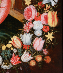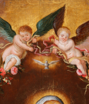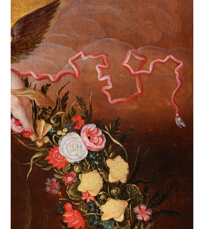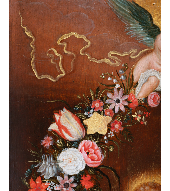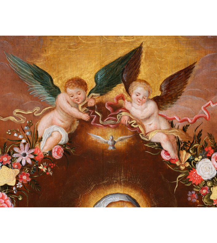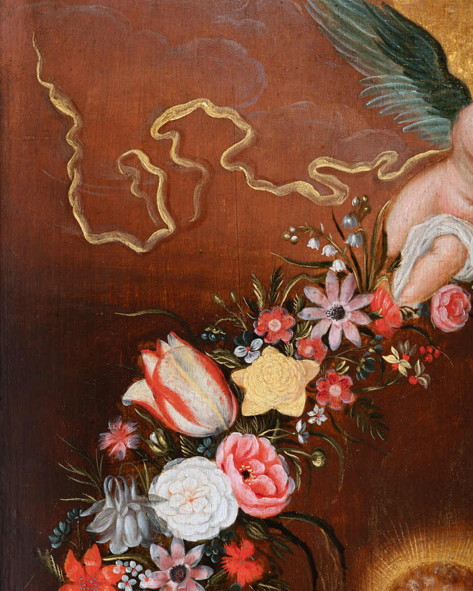 In our work, the Virgin and Jesus are placed in the center of the painting. Mary, seen from the knees up, seated, is dressed in a red dress and a blue-green mantle, she wears a veil on her blond hair and her left shoulder is covered by a blue embroidered yellow scarf. Her son Jesus stands in his mother's lap, one arm leaning on Mary’s shoulder. Their heads are surrounded by golden halos. The dove appears above a cloud and sends out rays of light. The celestial aspect is emphasized by two angels unfurling a garland of flowers. This drop-shaped garland, tied with floating blue ribbons, captivates the eye with the abundance and diversity of the flowers that compose it. Dominated by tulips: the most expensive flowers of the time: red tulips striped with white or white and yellow tulips striped with red, these were the most sought-after varieties during the "tulip mania", then came pink, white and red peonies, white and orange lilies, orange fritillaries, carnations, irises, snowballs, daffodils, blue bells, pansies and many more.