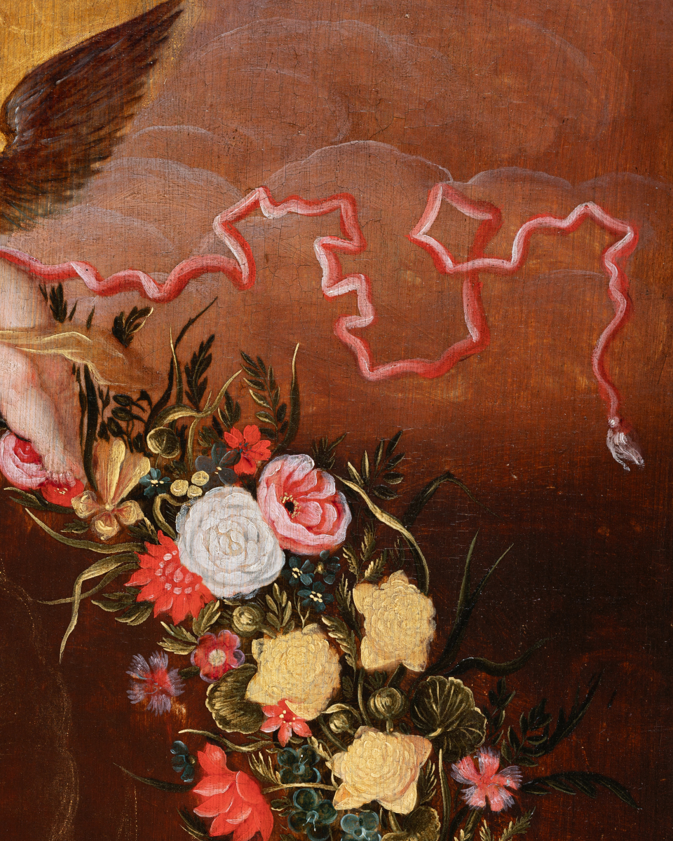 While flower garlands were a huge success among Antwerp painters, our painting, through its garland form, is unique to the body of work originating from Frans Francken II and his workshop.