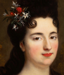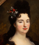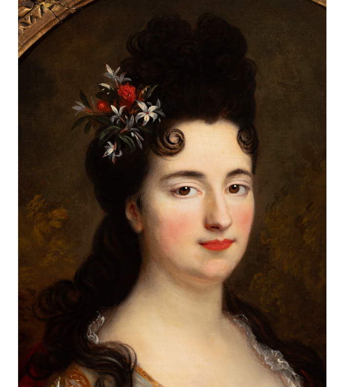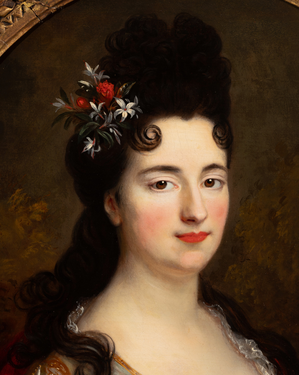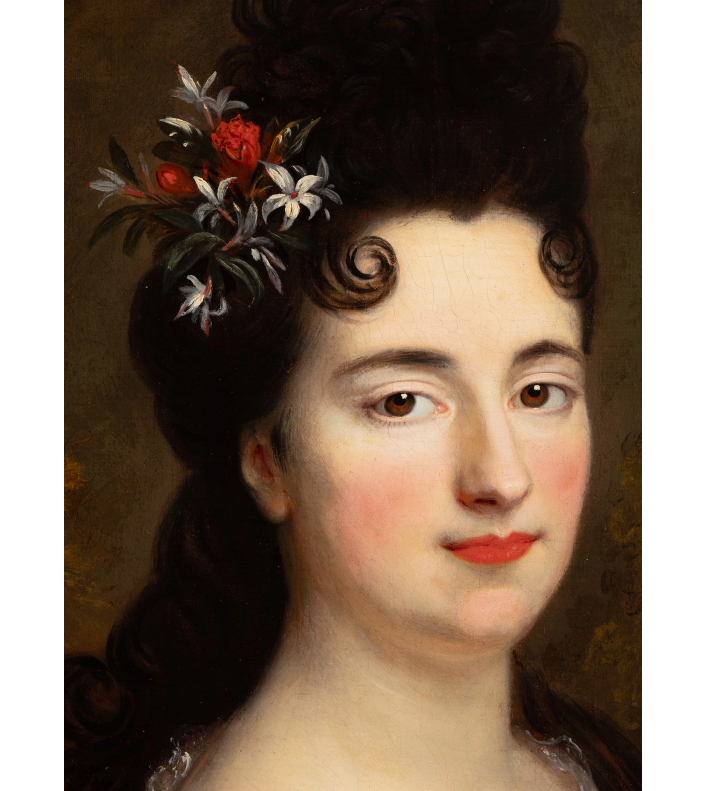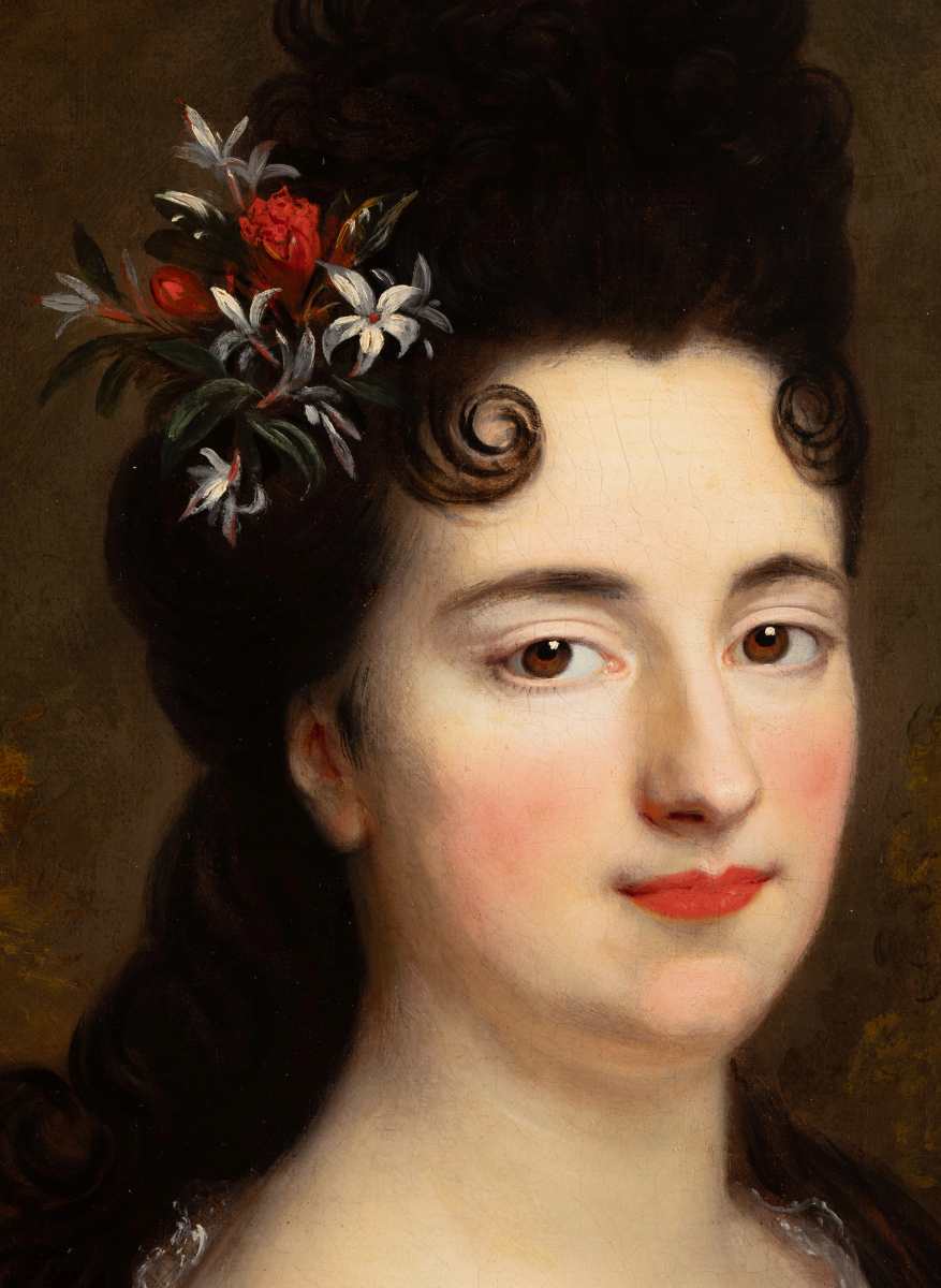 Featuring a rather high hairstyle " la Fontange", decorated with flowers, her dark brown hair frames her solemn face. The brown eyes, lively and intelligent, surrounded by delicate lines of her eyelashes and her slightly pursed lips give character to her face.