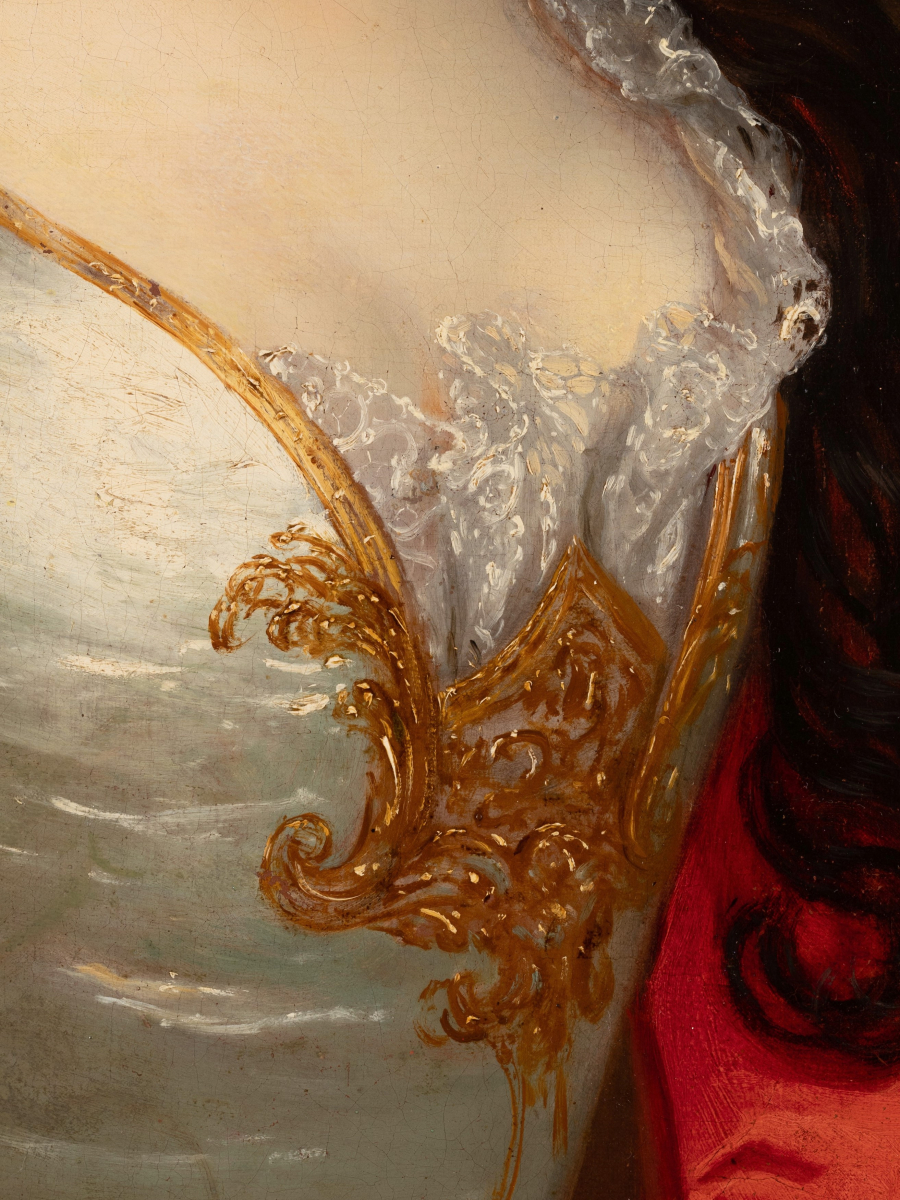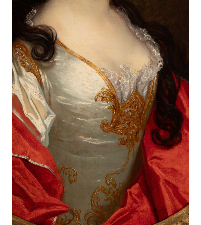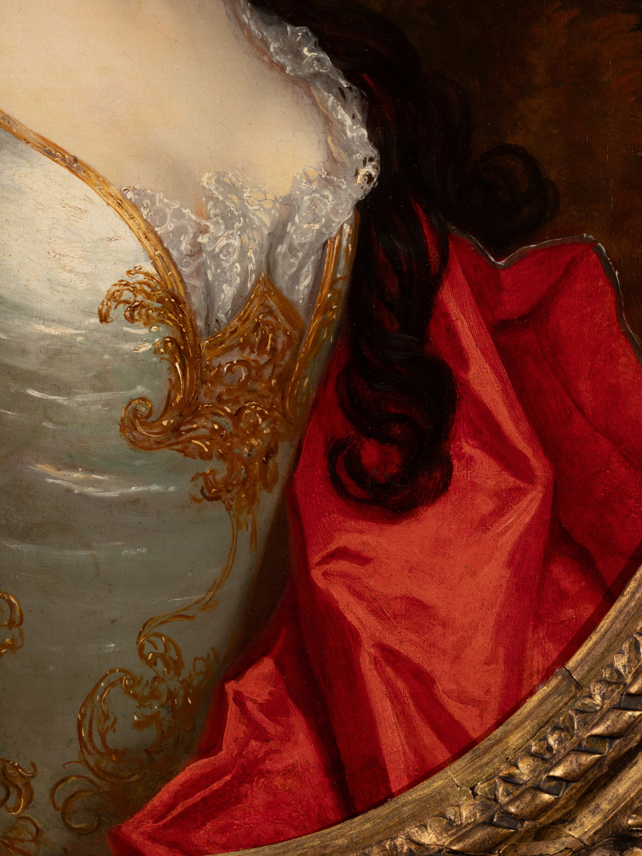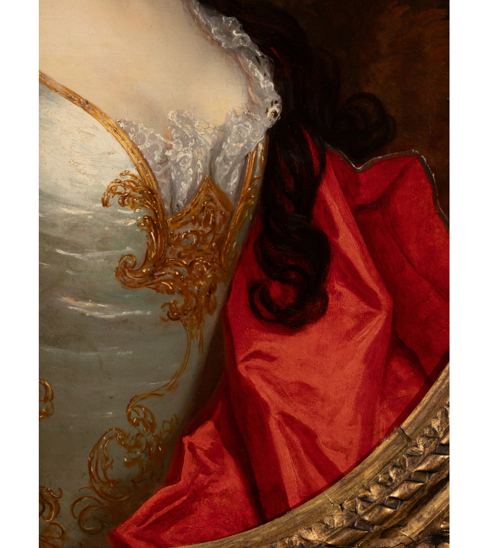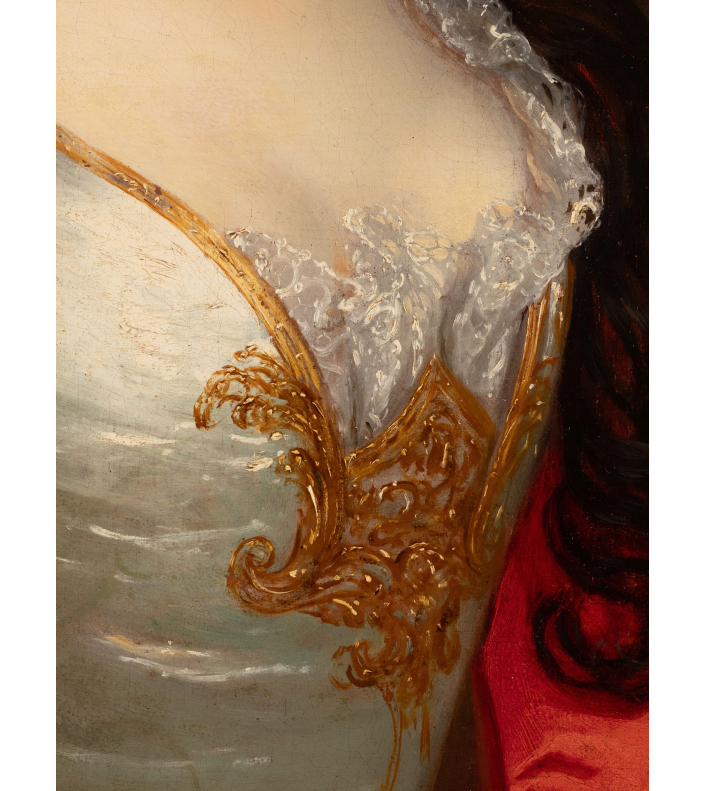 The tight framing propels the model who appears to us with all the intensity of life and in all the splendor of her rank, the elegance of the staging reflects the magnificence and the dazzling luxury of the receptions of the royal court under the reign of Louis XIV.