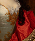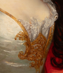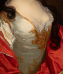 No jewels, tiaras, or clasps to compete her fresh complexions, the false simplicity cannot make us forget the magnificence of the fabrics. Her throat emerges from her bodice in white satin shining with silver, embroidered with gold threads creating many sparkling points catching light.