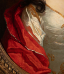 Light radiates from her figure with translucent white and pink flesh, wrapped in a sumptuous red satin cloak, which gives the dominant color to the painting,