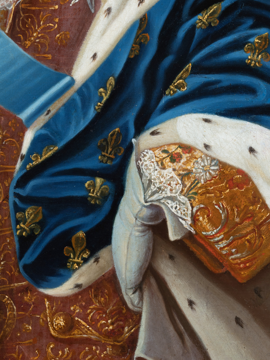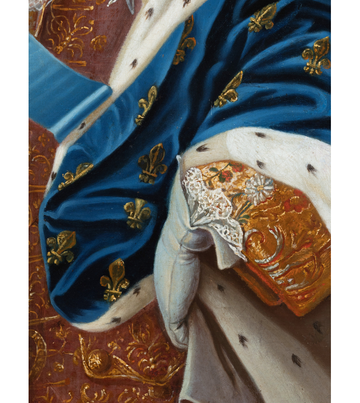 Our painting is a variant of a reduced size at mid-leg of a standing portrait of the young king, the original of which painted by Pierre Gobert (probably lost or destroyed) was engraved by Jean Audran. This portrait of the young Louis