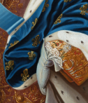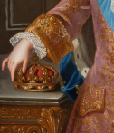 The right hand is placed on the royal crown which is in the foreground, while the left arm is folded and the hand is placed on the hip.