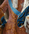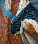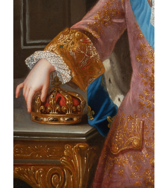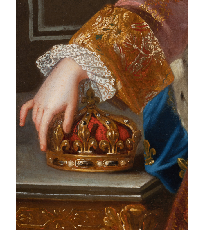 The young boy stands, seen at mid-thigh, near a console covered by his ermine mantle presenting the royal crown. In court dress, dressed in an embroidered jerkin with brocade-lined sleeves, a white lace tie around his neck, he wears the blue ribbon of the Order of the Holy Spirit slung over his shoulder while the white dove of the order is stapled to his vest.