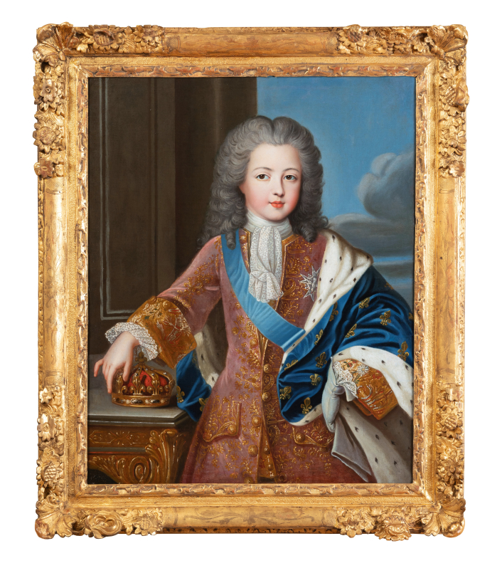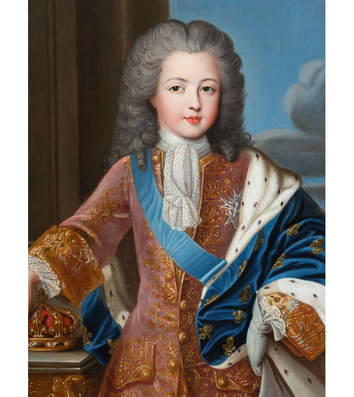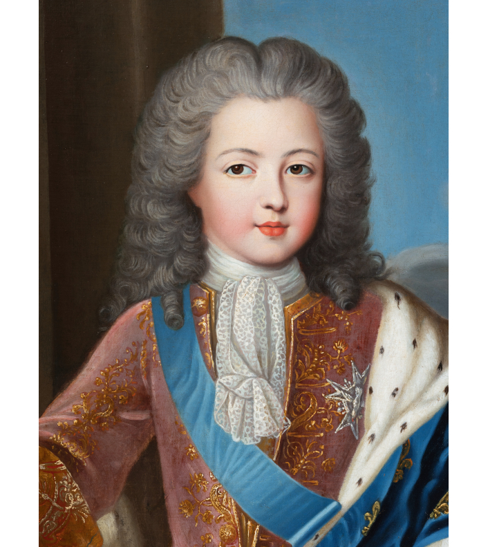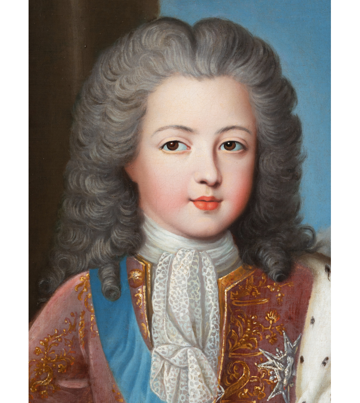 This composition highlighting the young monarch in court dress, more touching and intimate, than his portrait executed by Rigaud in coronation dress, allows us to better detect the art and style of Pierre Gobert, great court portraitist, working for Louis XIV, the Regent and then for Louis XV, he was one of the rare painters of his time to paint real portraits of children. His sensitivity was noticed by the Duchess of Lorraine, the sister of the Regent, mother of 14 children who had ordered numerous effigies of her offspring from him.