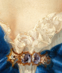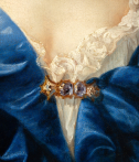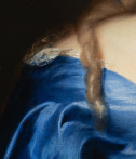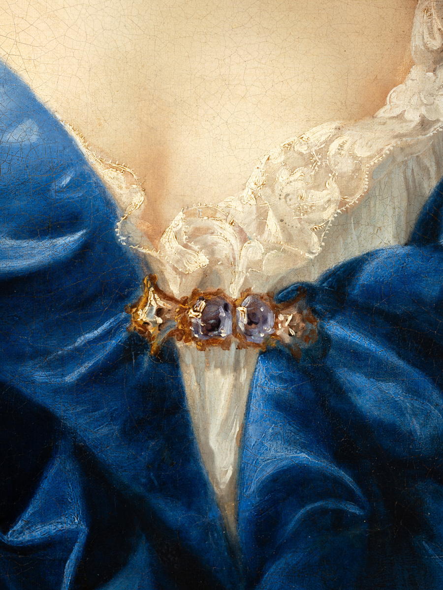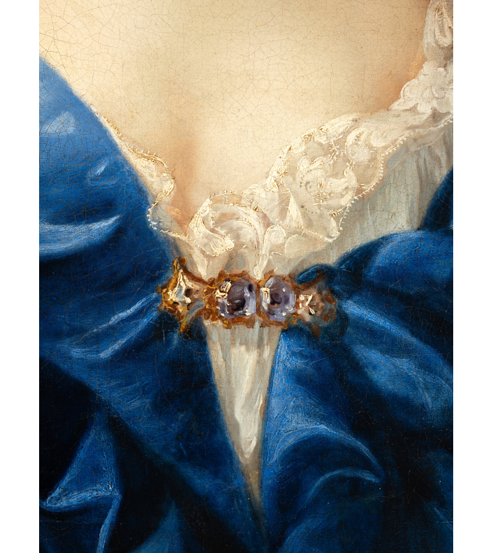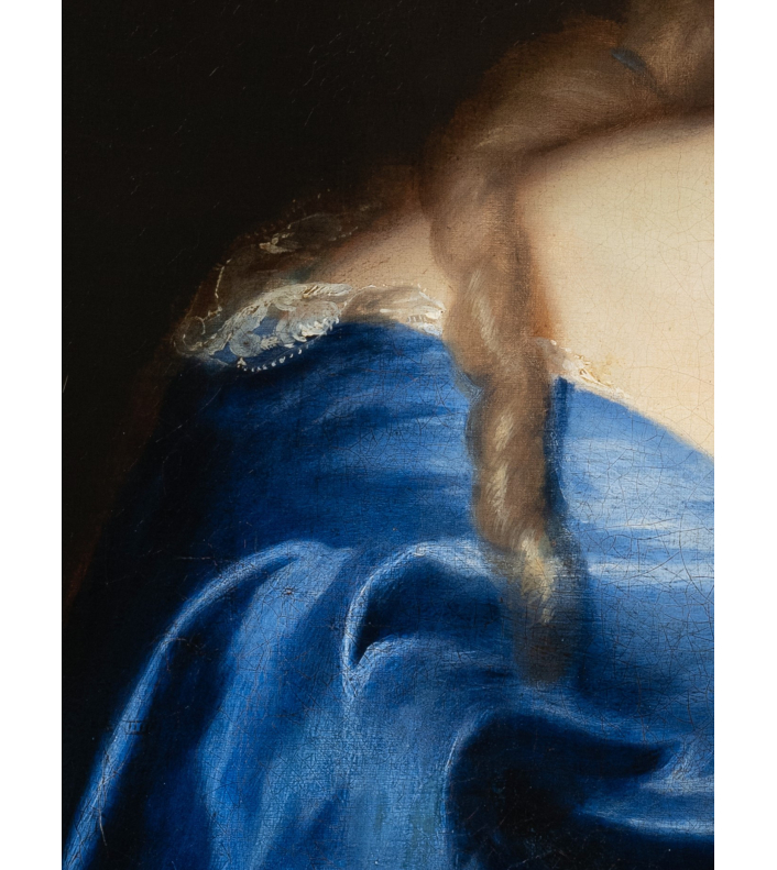 She is dressed in a white blouse adorned with lace, revealing a plunging neckline, and a magnificent satin stole of intense lapis blue. Held by a clasp of sparkling gemstones, the ends of the scarf barely rest on her shoulders. Its ample fabric, ready to slip and reveal the young woman's charms, combined with the spontaneity of the pose and the apparent simplicity, lends a frivolous lightness to the whole.