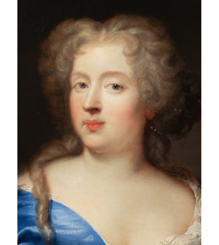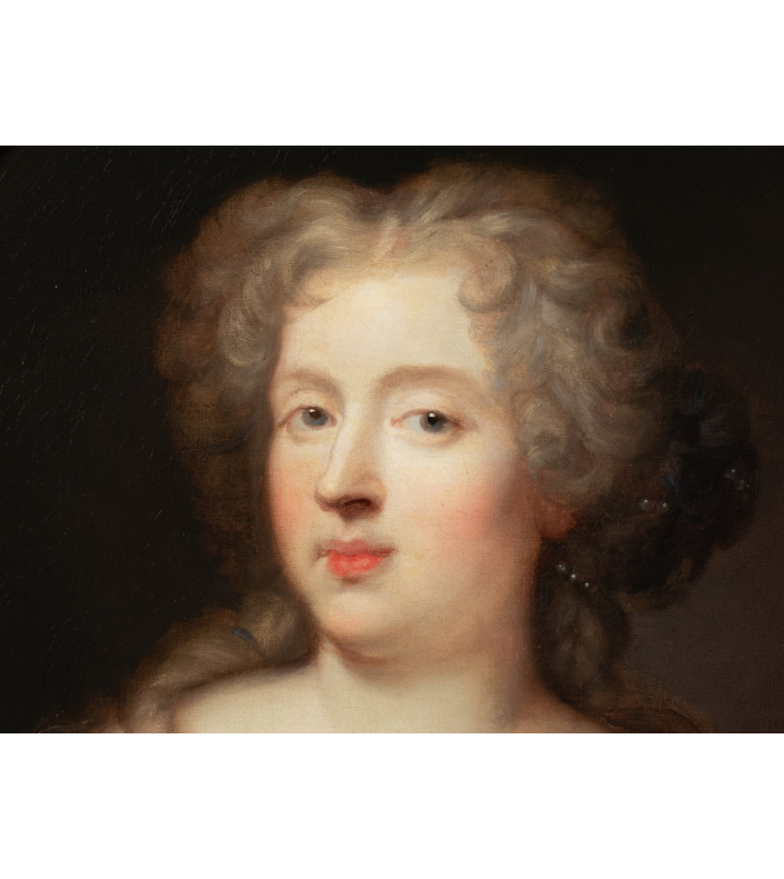She gazes at the viewer with her large, azure blue eyes, their lids slightly lowered, giving her a languid air, accentuated by her sensual mouth. Her pearly white complexion is rendered with translucent brushstrokes; the resulting transparency is a distinctive mark of François de Troy, combined with his technique of using subtle shadows in the treatment of flesh to achieve a velvety and silky effect.
