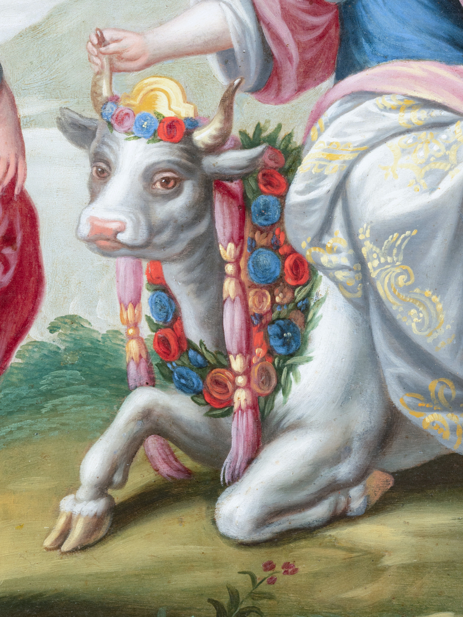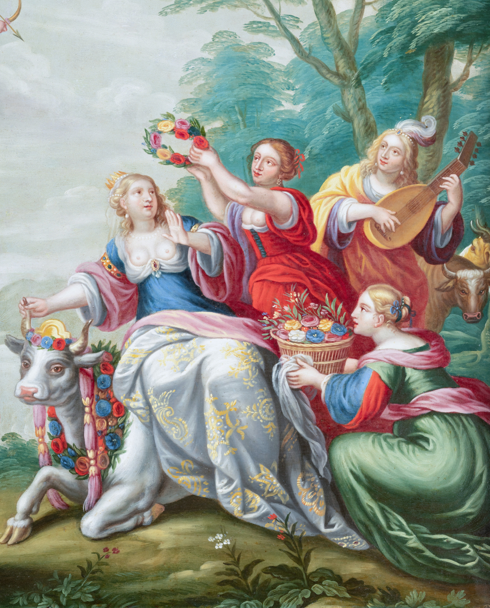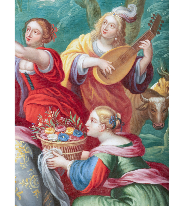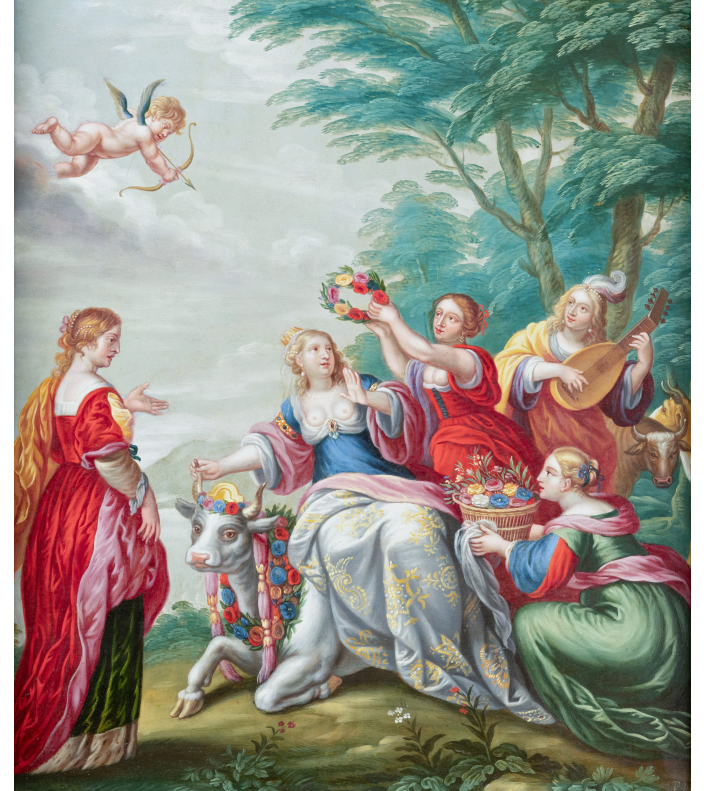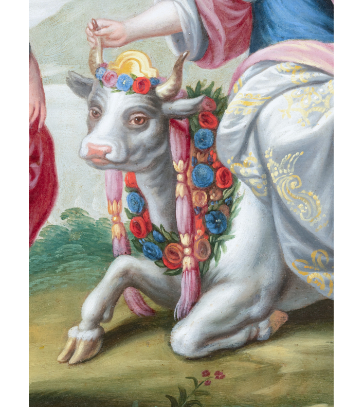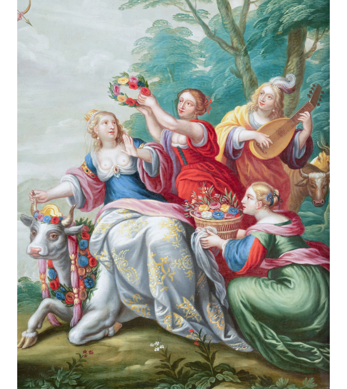 In the center of a wooded clearing, the courageous princess has just climbed on the back of the white bull (Zeus) adorned with a garland of flowers around his neck. The young woman's attendants, all elegantly dressed in colorful fabrics, carry offerings to the princess, a crown of flowers, a basket filled with flowers. One of her attendants celebrates the festivities by playing the lute. In the upper left corner, Cupid, flying in the sky, shoots an arrow.