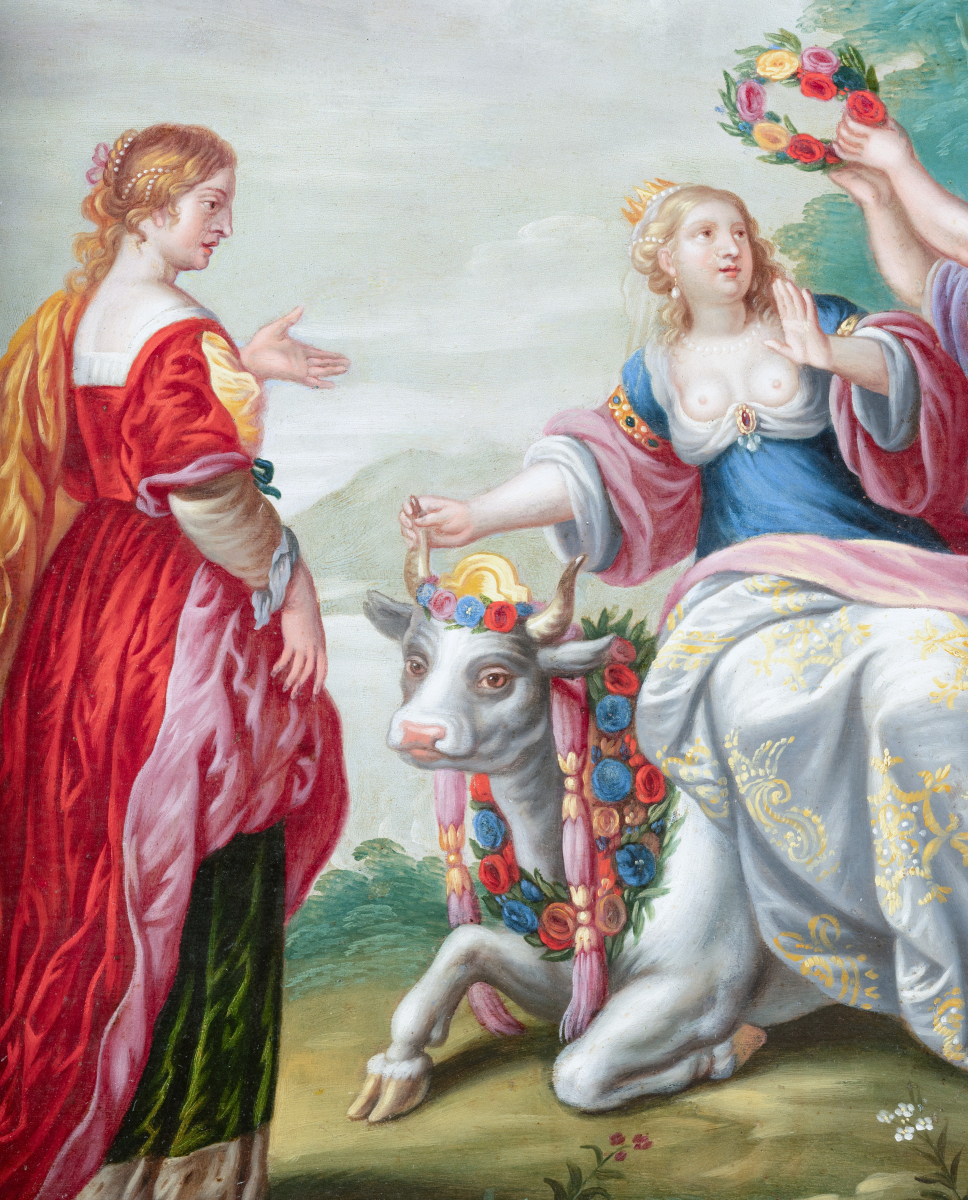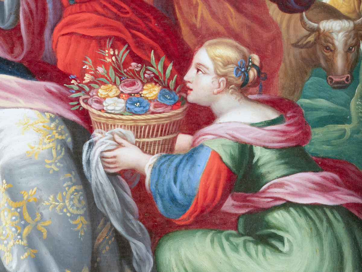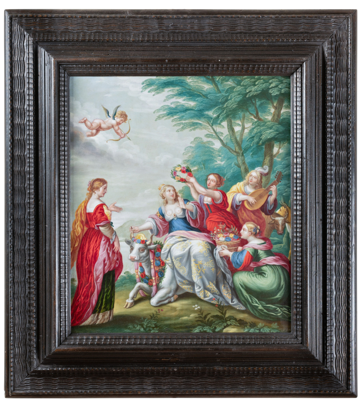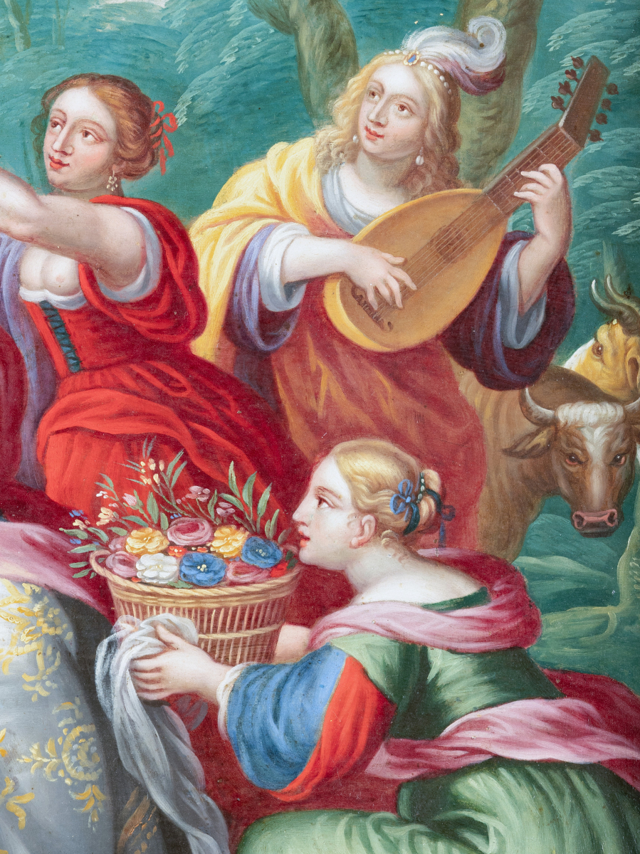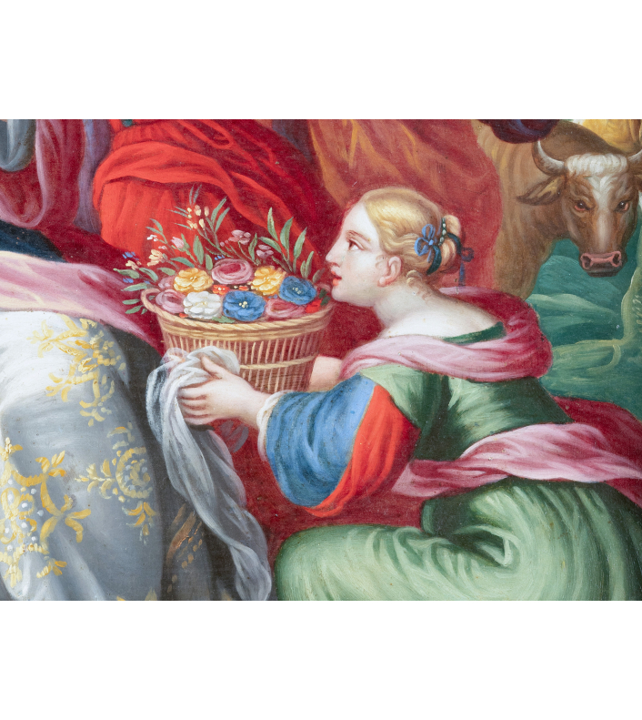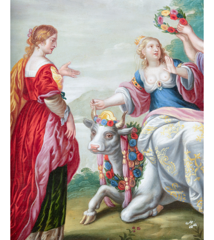 In the center of a wooded clearing, the courageous princess has just climbed on the back of the white bull (Zeus) adorned with a garland of flowers around his neck. The young woman's attendants, all elegantly dressed in colorful fabrics, carry offerings to the princess, a crown of flowers, a basket filled with flowers. One of her attendants celebrates the festivities by playing the lute. In the upper left corner, Cupid, flying in the sky, shoots an arrow.
