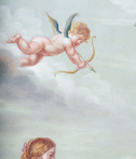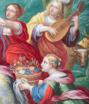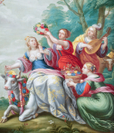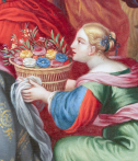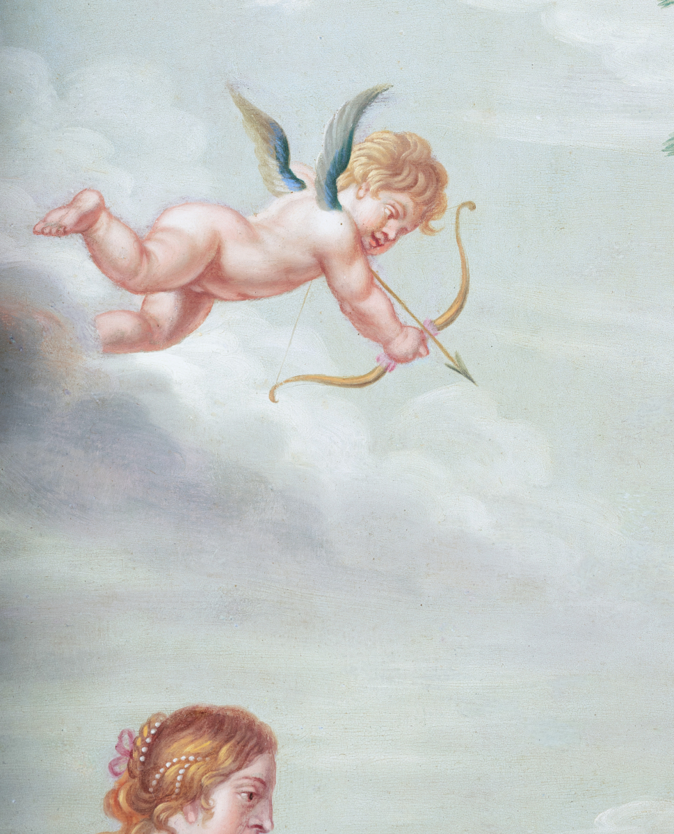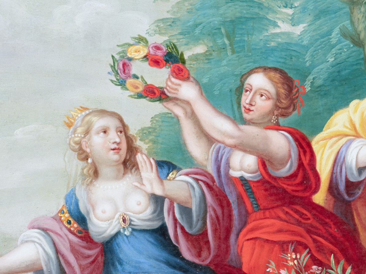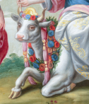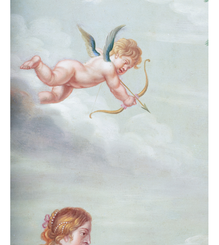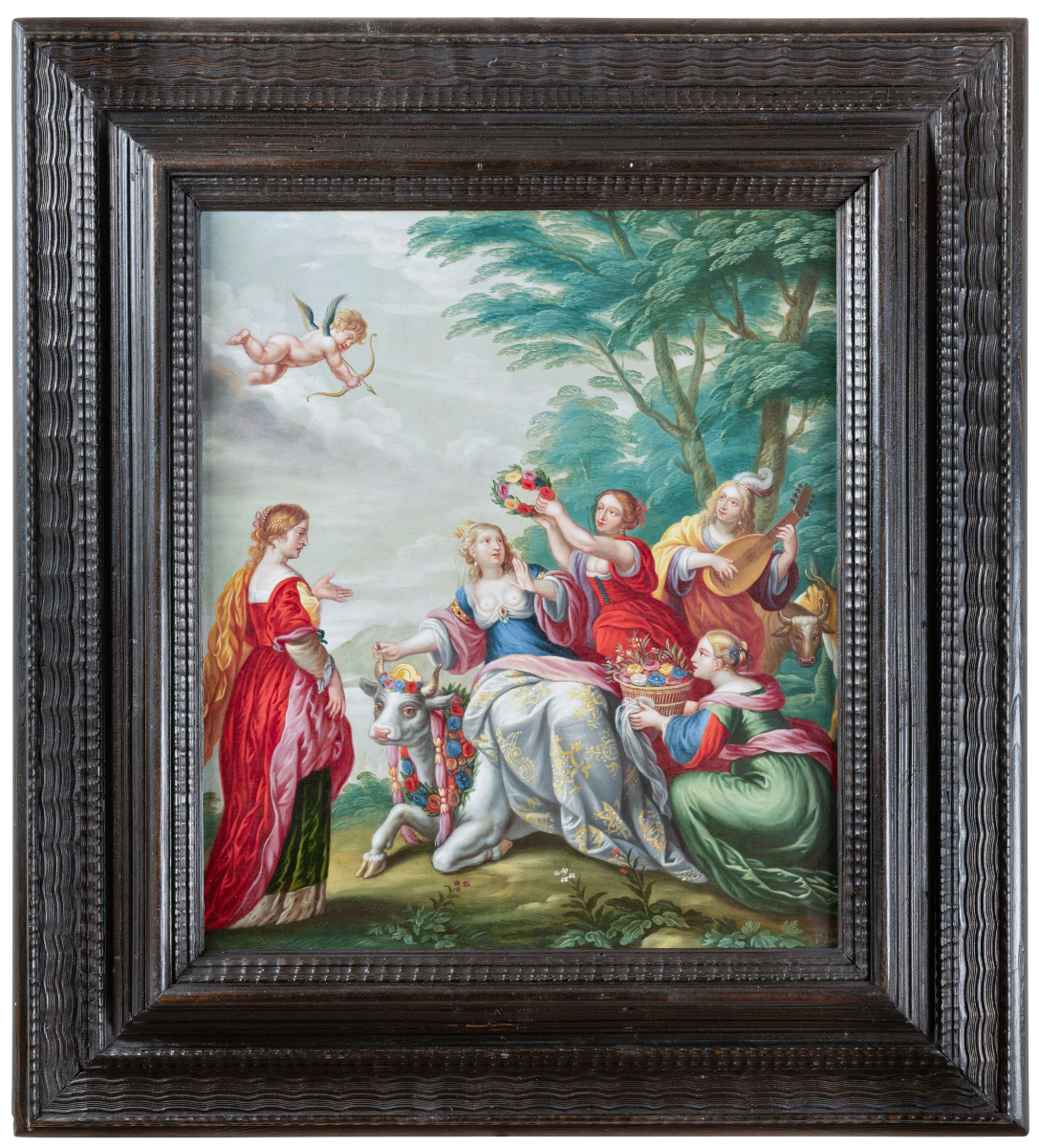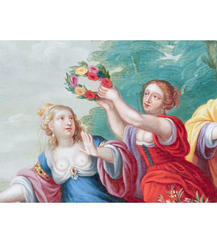 In the center of a wooded clearing, the courageous princess has just climbed on the back of the white bull (Zeus) adorned with a garland of flowers around his neck. The young woman's attendants, all elegantly dressed in colorful fabrics, carry offerings to the princess, a crown of flowers, a basket filled with flowers. One of her attendants celebrates the festivities by playing the lute. In the upper left corner, Cupid, flying in the sky, shoots an arrow.