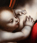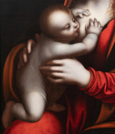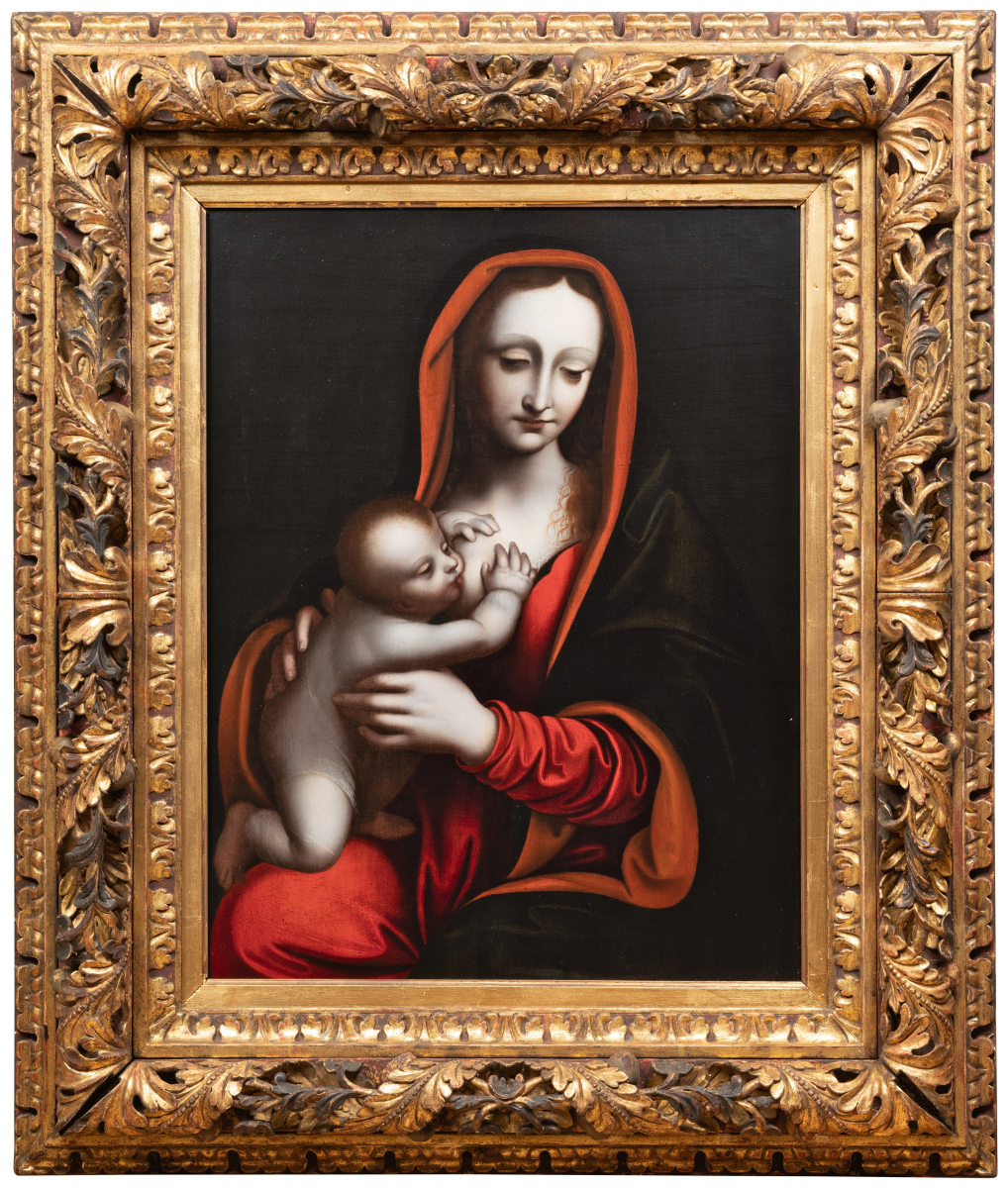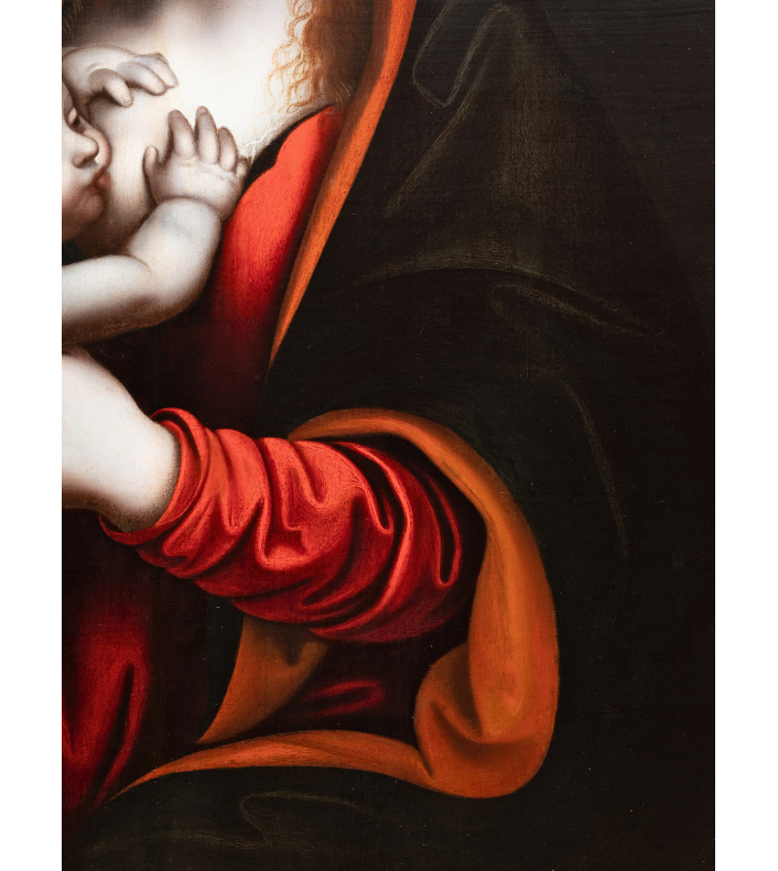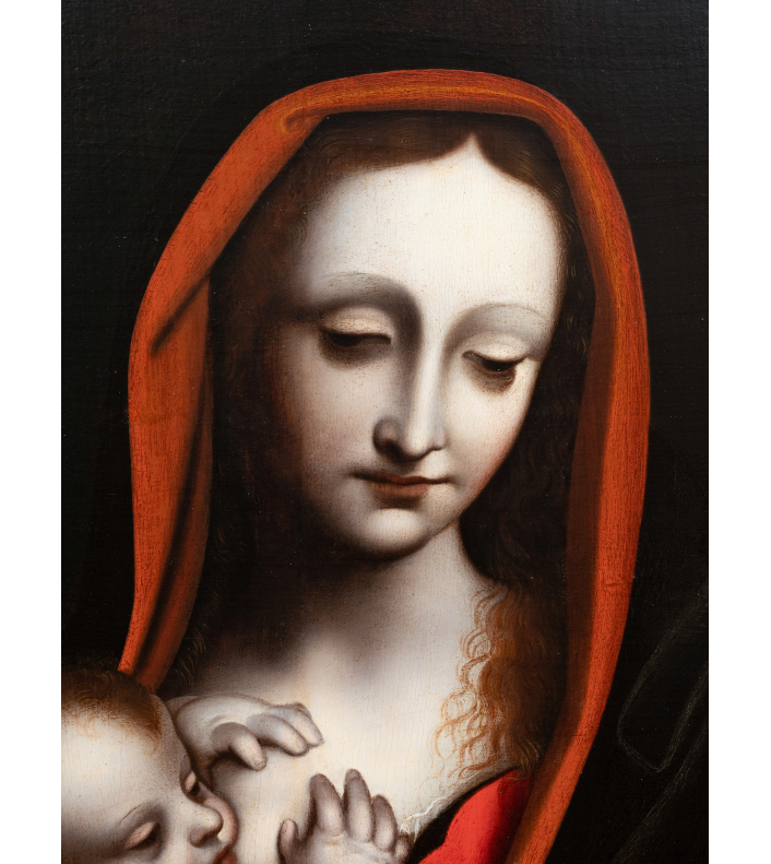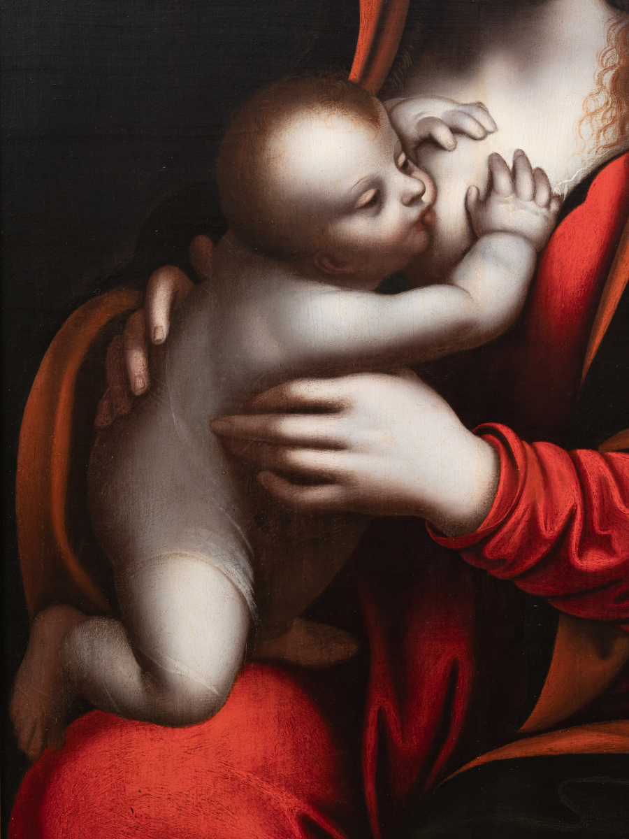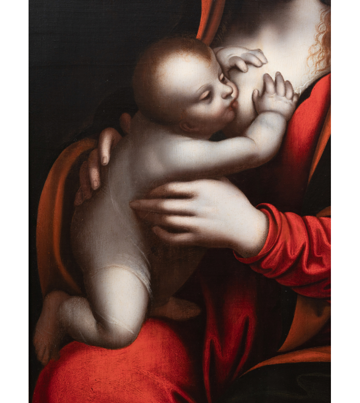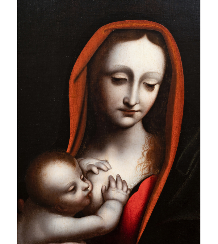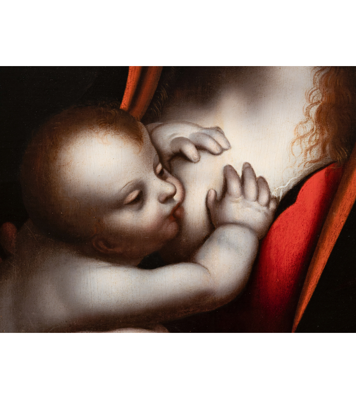 The theme of the Virgin breastfeeding the Child Jesus, the Virgo lactans , is one of the oldest and most venerated in Christian iconography. In Italy, this image developed from the second half of the 14th century. Andrea Solario was able to see various examples in Lombardy as well as in Veneto, where he lived during his youth. In Milan, following in the footsteps of Leonardo da Vinci, several artists sought to find a lively and natural interaction between mother and child, with a tender expression. The model is the Madonna Litta in the Hermitage, a composition probably conceived by Leonardo da Vinci but painted by one of his pupils, probably Marco d'Oggiono, in the early 1490s (attributed to Leonardo da Vinci, Virgin nursing the Child, known as Madonna Litta, circa 1490-92, woodcut transferred to canvas, 42 x 33 cm, St. Petersburg, Hermitage Museum, GE249).
