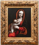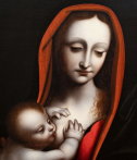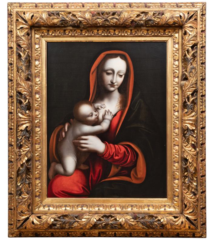 Our panel depicts the Virgin and Jesus in a moving and intimate setting, the chiaroscuro accentuating a mystical atmosphere of this act of breastfeeding that forms a bond between mother and child.