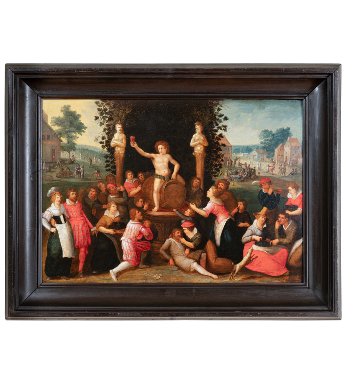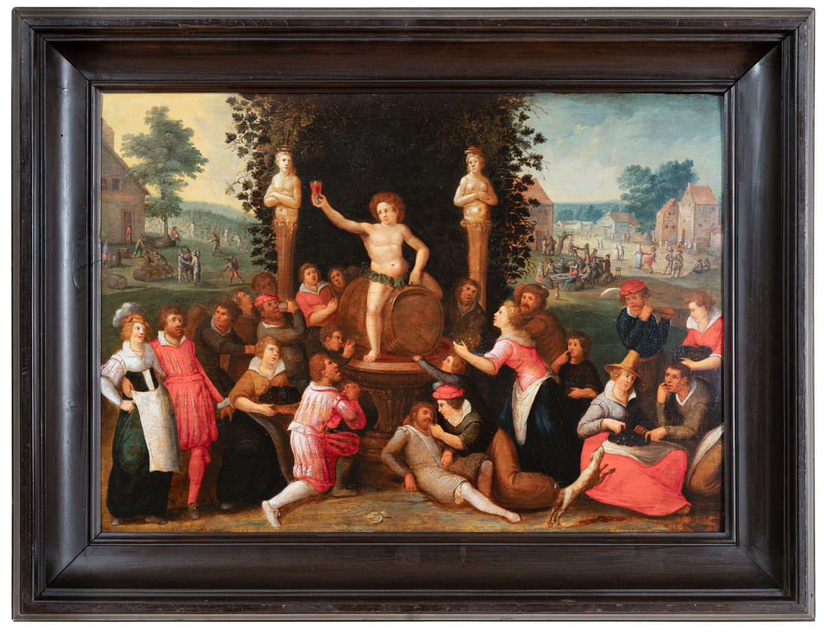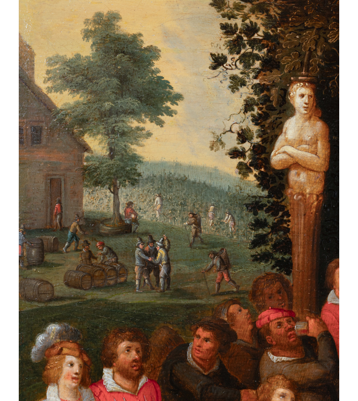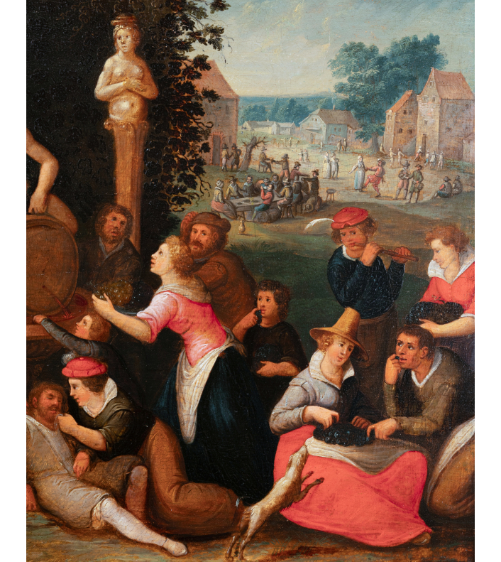 Le premier plan dominant et rapproché, mais complètement fantaisiste illustre Bacchus entouré de villageois adorateurs, tandis que le second plan témoigne de la vie réelle dans les campagnes flamandes.