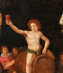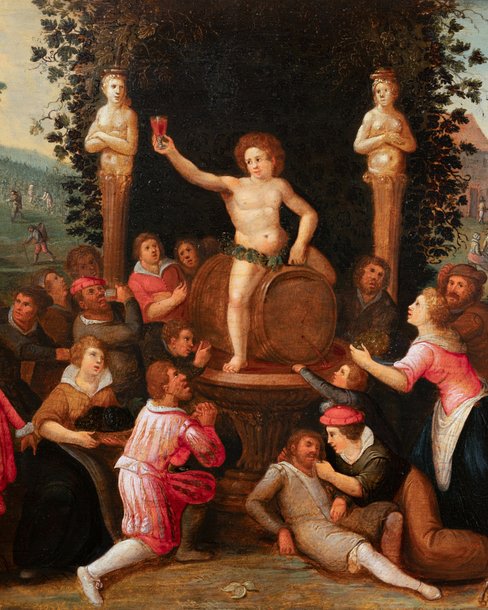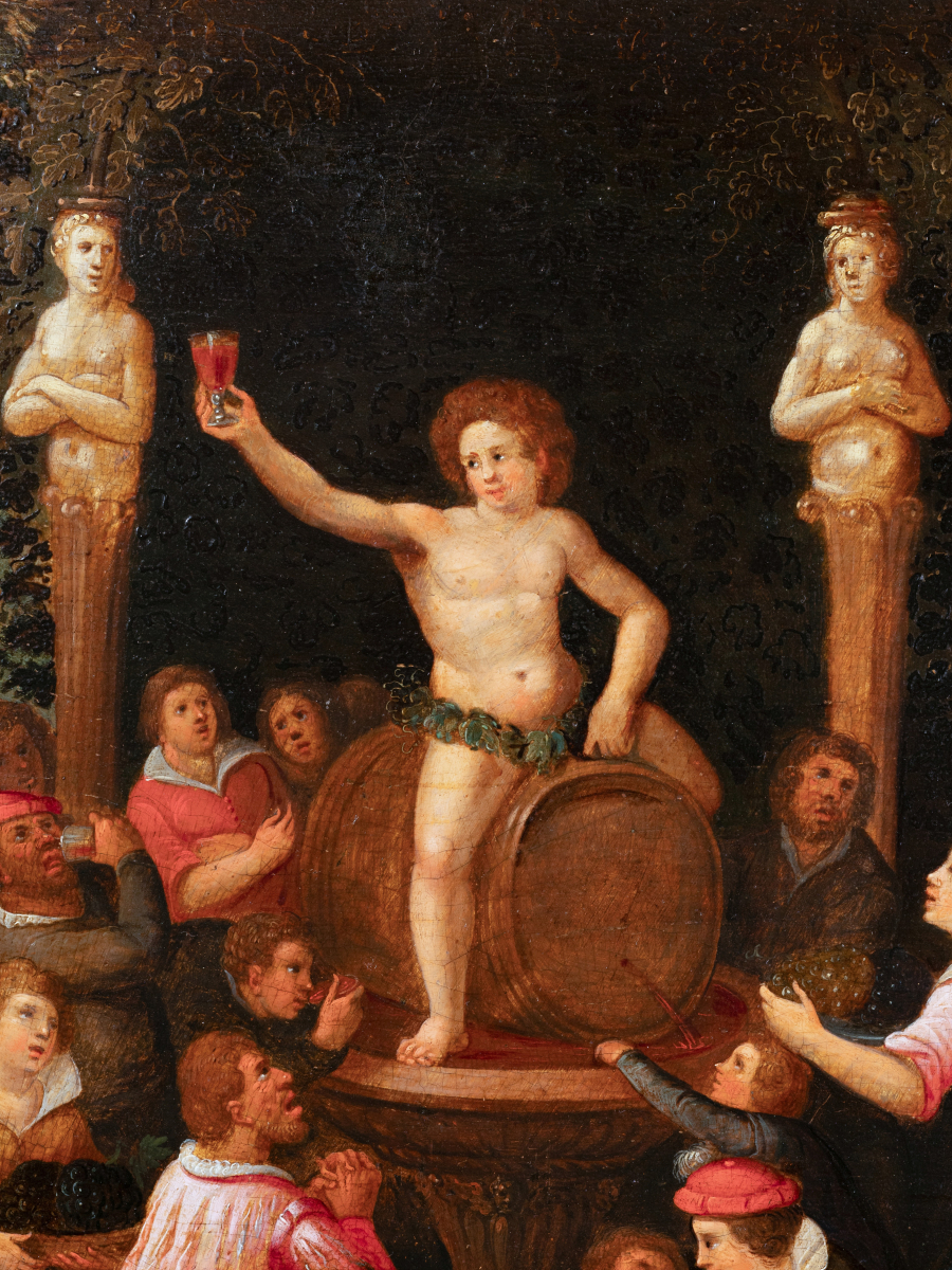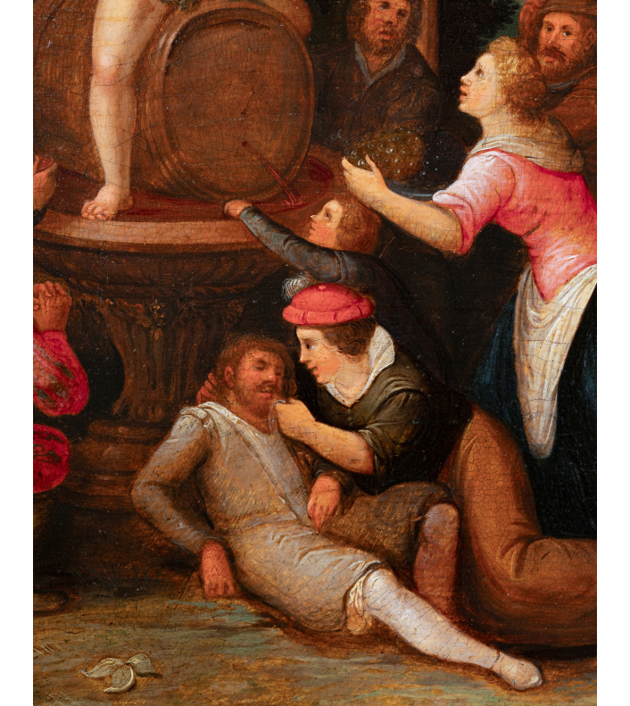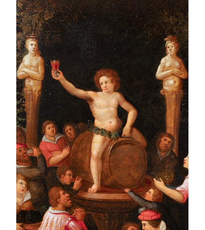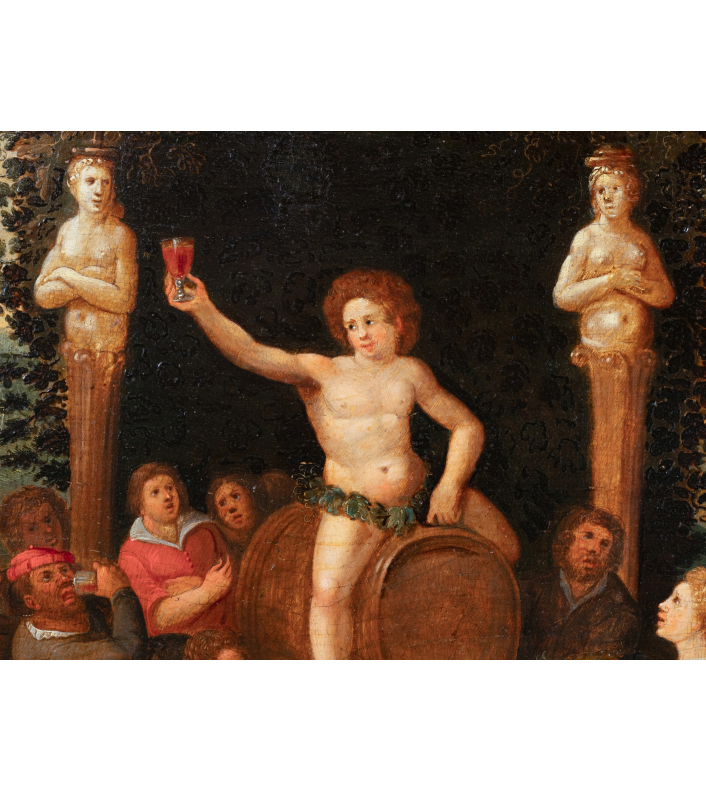 Dans le cadre de notre tableau, la joyeuse bacchanale en l'honneur de Bacchus dieu de l’excitation, de la frénésie, de l’enthousiasme et du vin se produit sur deux registres.