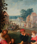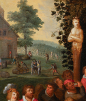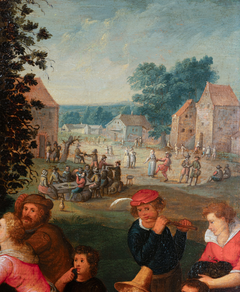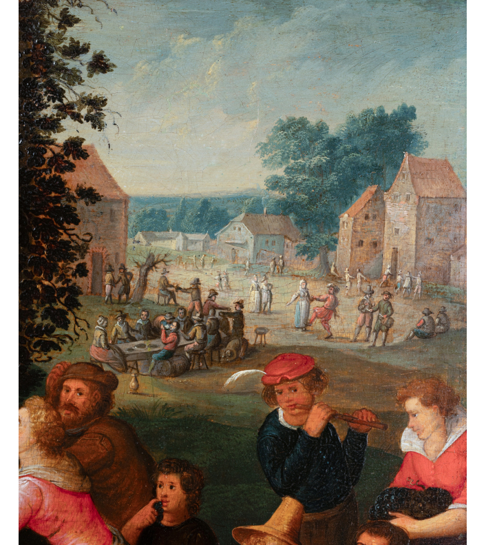 A droite de la composition, une kermesse paysanne réunit des villageois dans l’ambiance de liesse générale et de beuverie campagnarde.