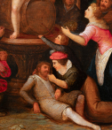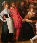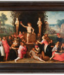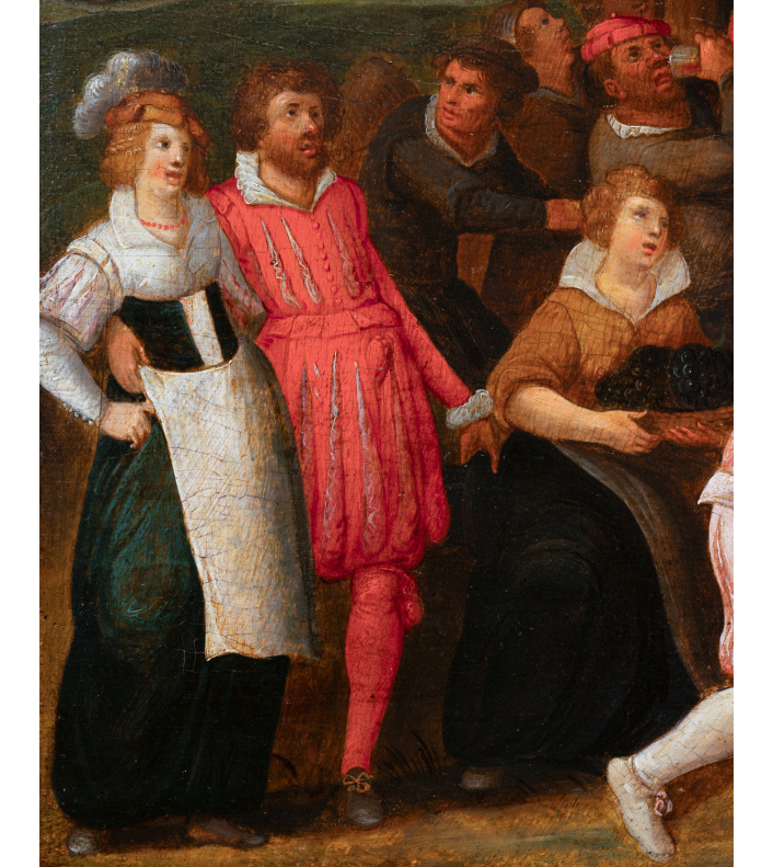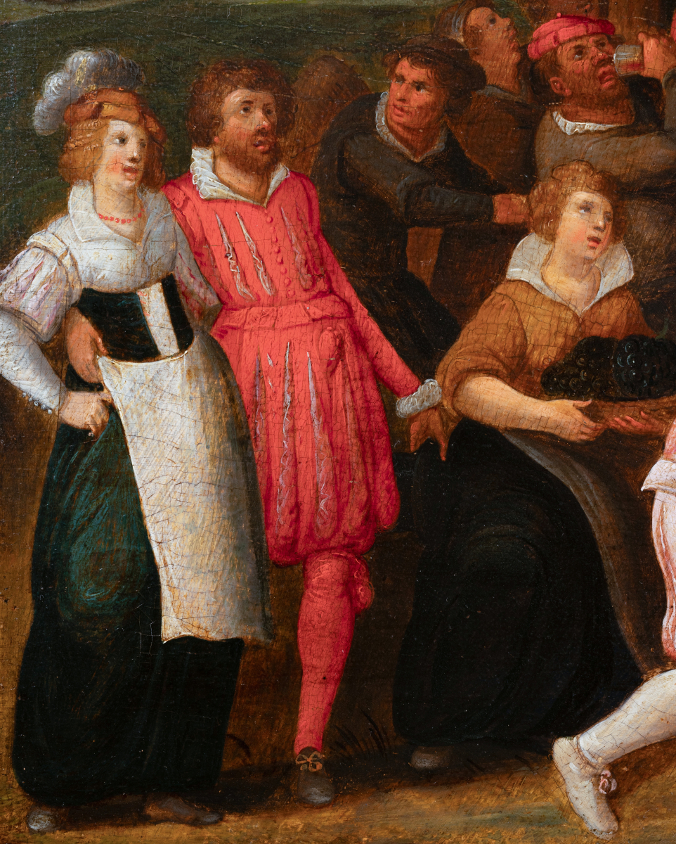 Loin des festins dans les palais et jardins avec des figures raffinées, l’artiste nous livre ici la vie rustique à la campagne avec ses joies et célébrations et des gens simples dans leur existence quotidienne. Inspiré par le réalisme éloquent des fêtes populaires de Pieter Brueghel l’Ancien, Louis de Caullery façonne ses scènes de genre avec un subtil mélange de grotesque et de sophistiqué qui lui avait valu un succès remarquable auprès de sa clientèle anversoise et européenne.