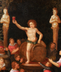 Ainsi nous retrouvons d’abord le Bacchus assis à califourchon sur un tonneau percé levant son verre rempli de vin rouge, placé sur un piédestal sur fond d’une tonnelle de vigne flanqué de cariatides, acclamé par des nombreux villageois venus lui rendre hommage, remercier pour la récolte et présenter les offrandes de grappes de raisin.