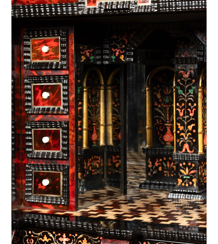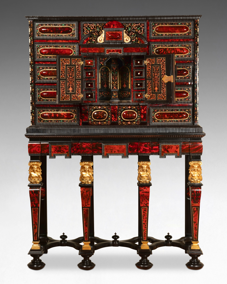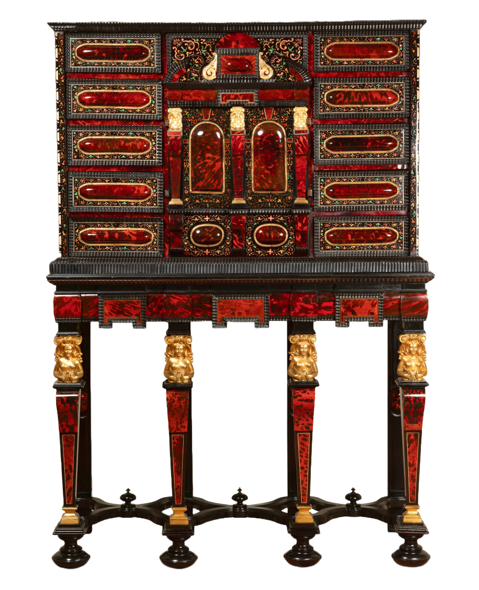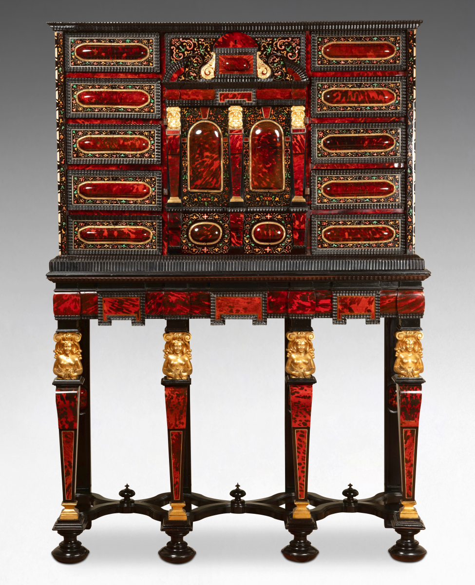 Rare cabinet d’apparat que nous présentons, outre un décor époustouflant d’écaille de tortue, ébène et ivoire, est orné de laque incrustée, technique spécifiquement anversoise apparue au milieu du XVIIème siècle que l’on retrouve sur un nombre très réduit de meubles et objets.