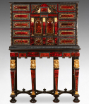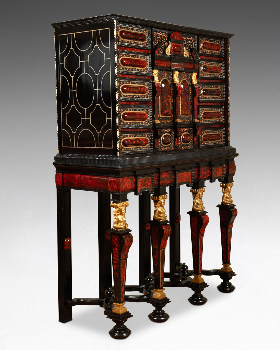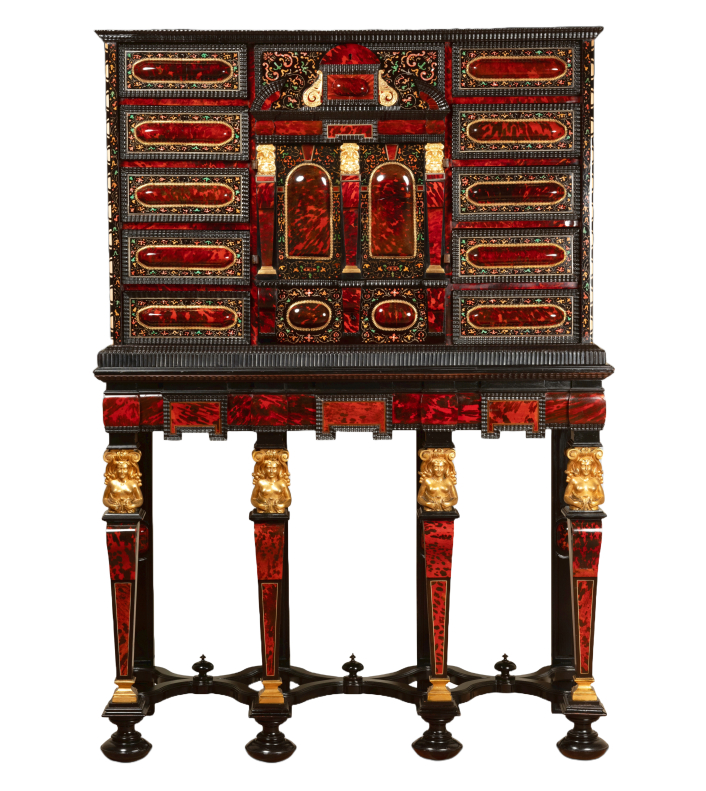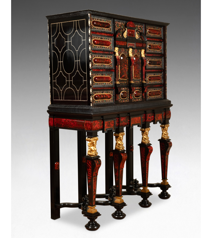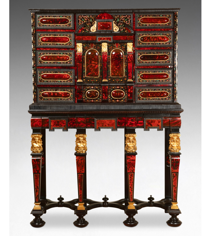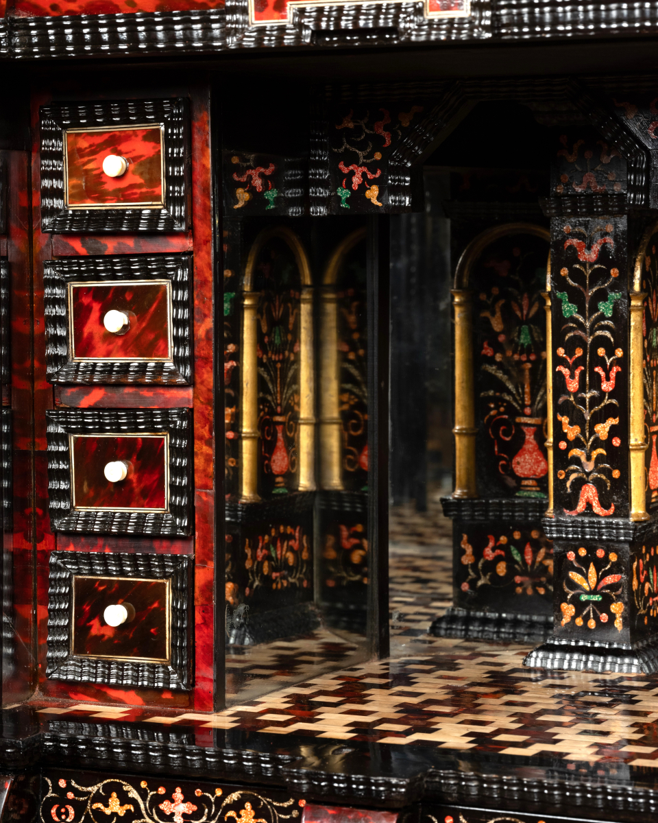 Rare cabinet d’apparat que nous présentons, outre un décor époustouflant d’écaille de tortue, ébène et ivoire, est orné de laque incrustée, technique spécifiquement anversoise apparue au milieu du XVIIème siècle que l’on retrouve sur un nombre très réduit de meubles et objets.