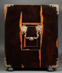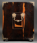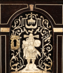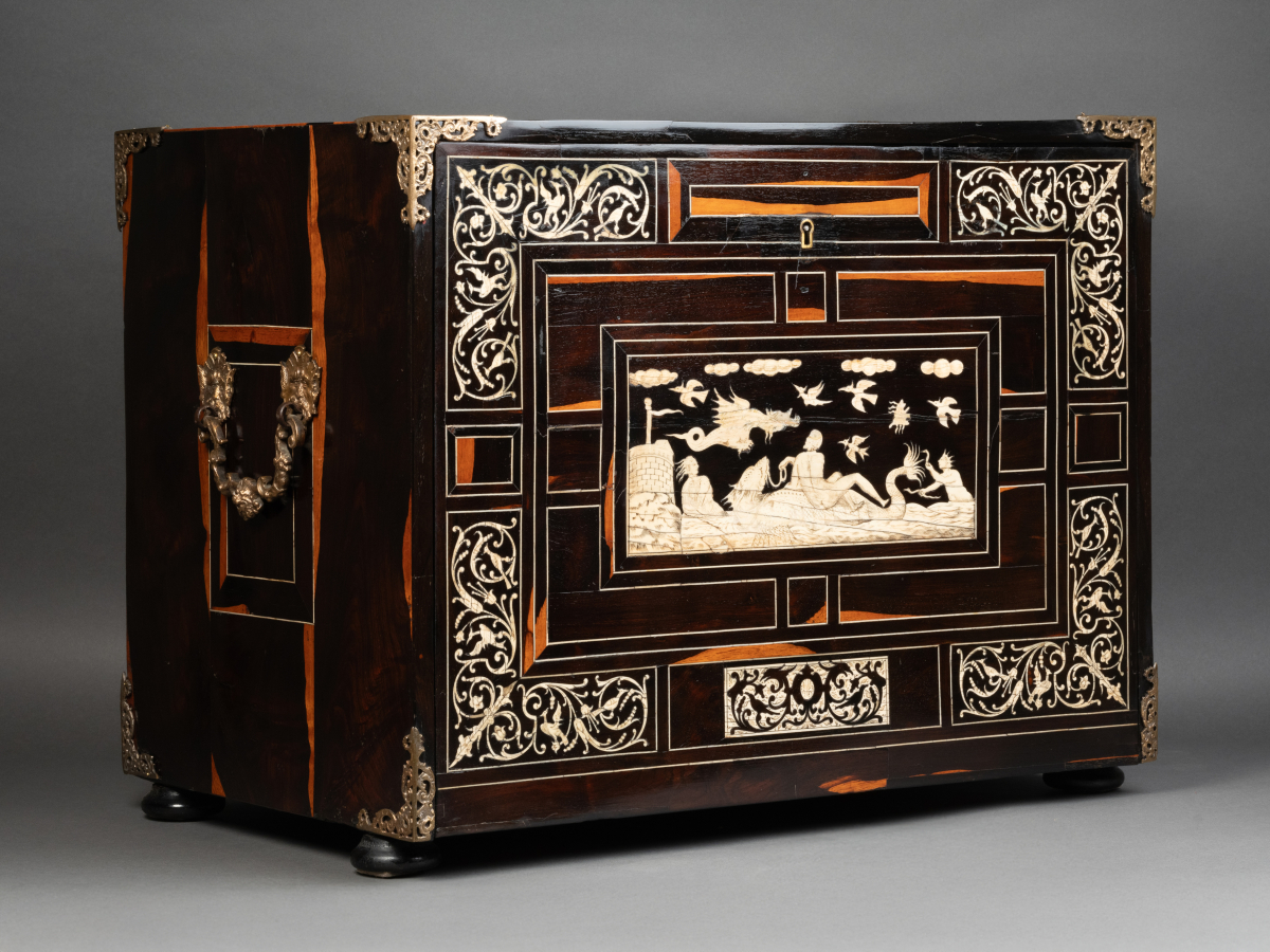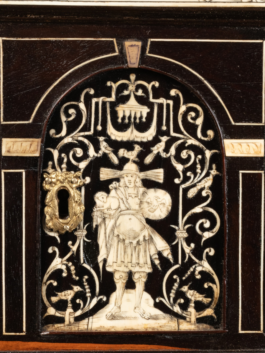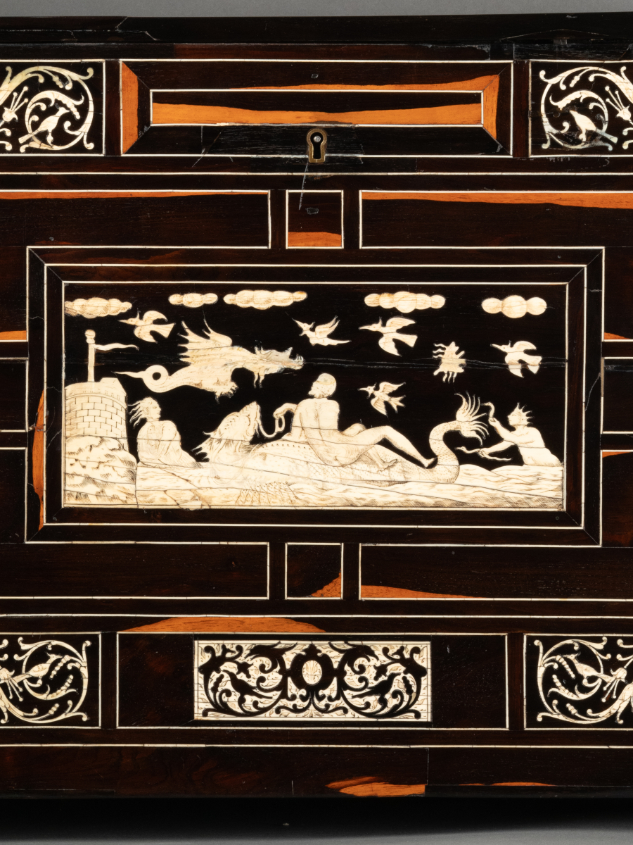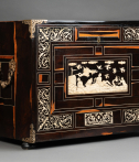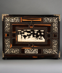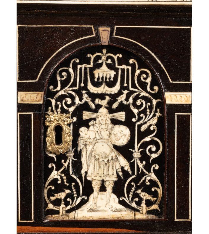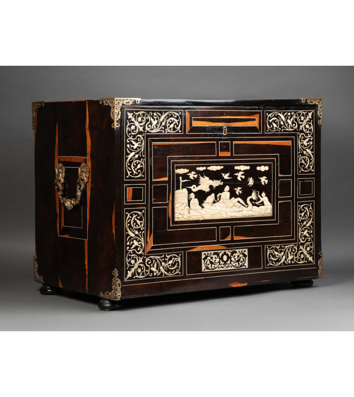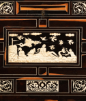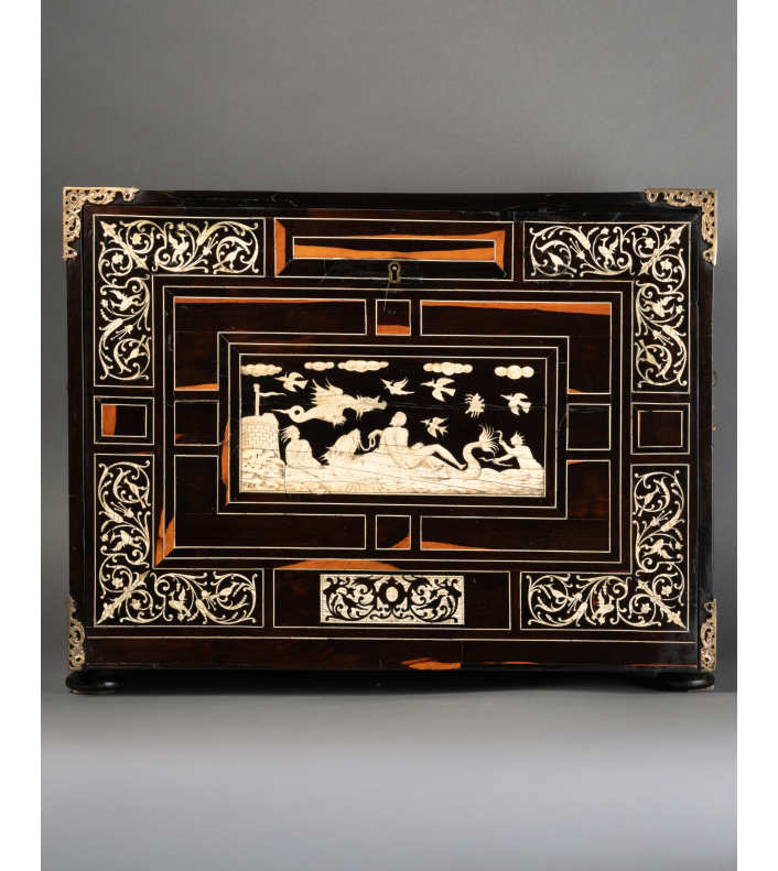 L’extérieur de l’abattant reçoit un décor soigné d’arabesques, volutes, fleurs, oiseaux stylisés en ivoire sur fond d’ébène. La partie centrale représente une scène mythologique.