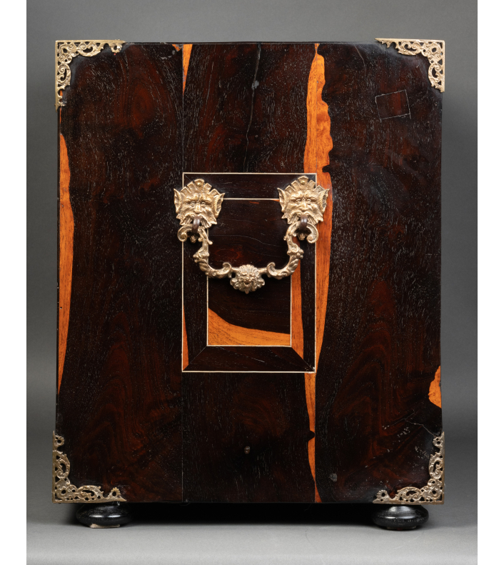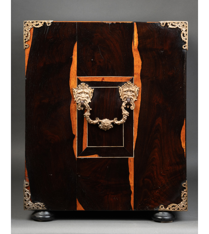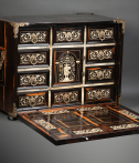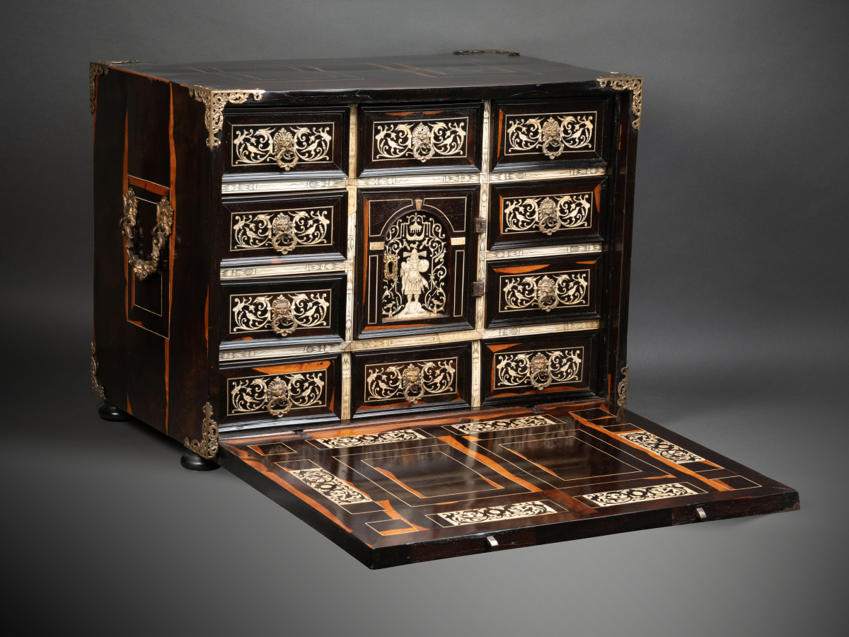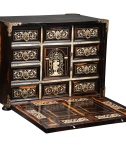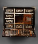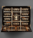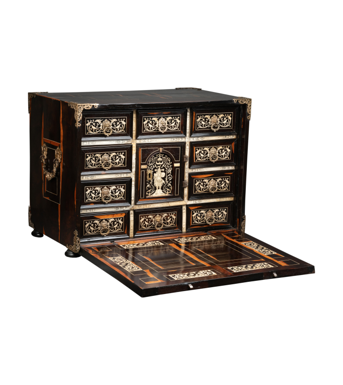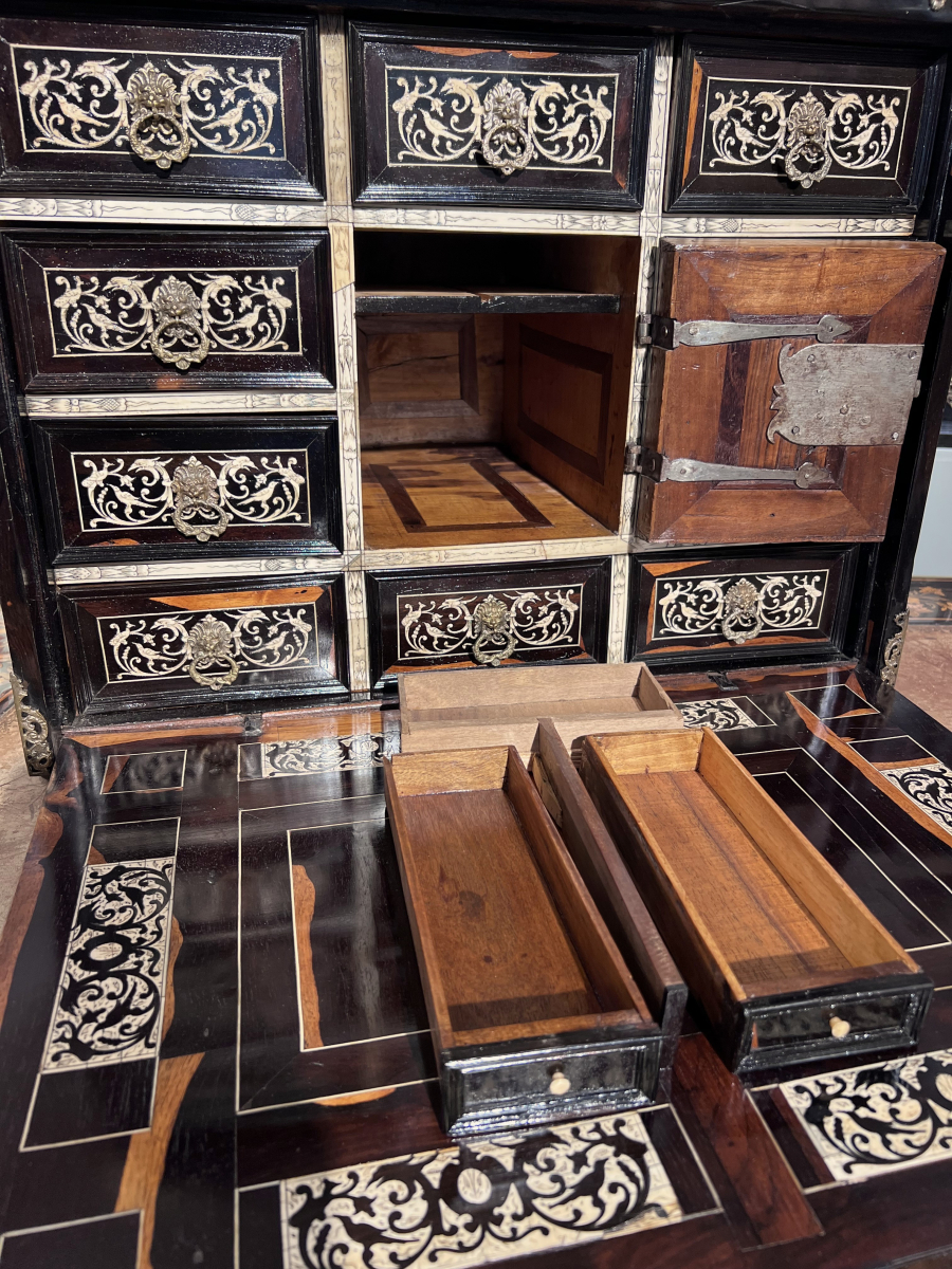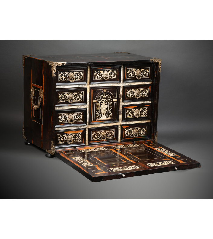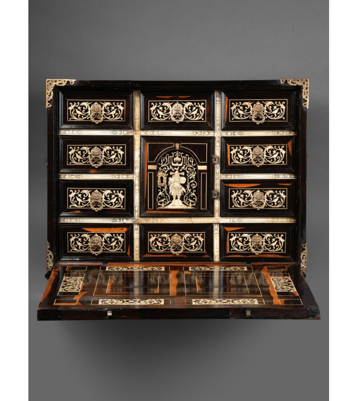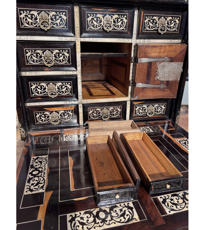 Ce précieux cabinet ouvre par un abattant qui découvre une série de huit tiroirs, le rang inférieur constituant un seul tiroir, et au centre une petite porte révélant une niche avec deux tiroirs. Les tiroirs intérieurs grâce à un système ingénieux dissimulent un tiroir secret.