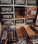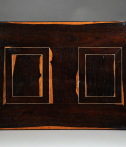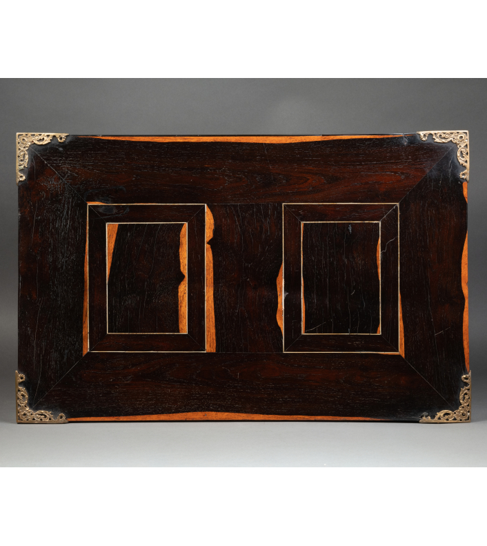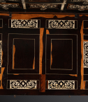 Les côtés et les dessus sont en placage d’ébène et incrustations de filets d’ivoire, le tout formant des rectangles.