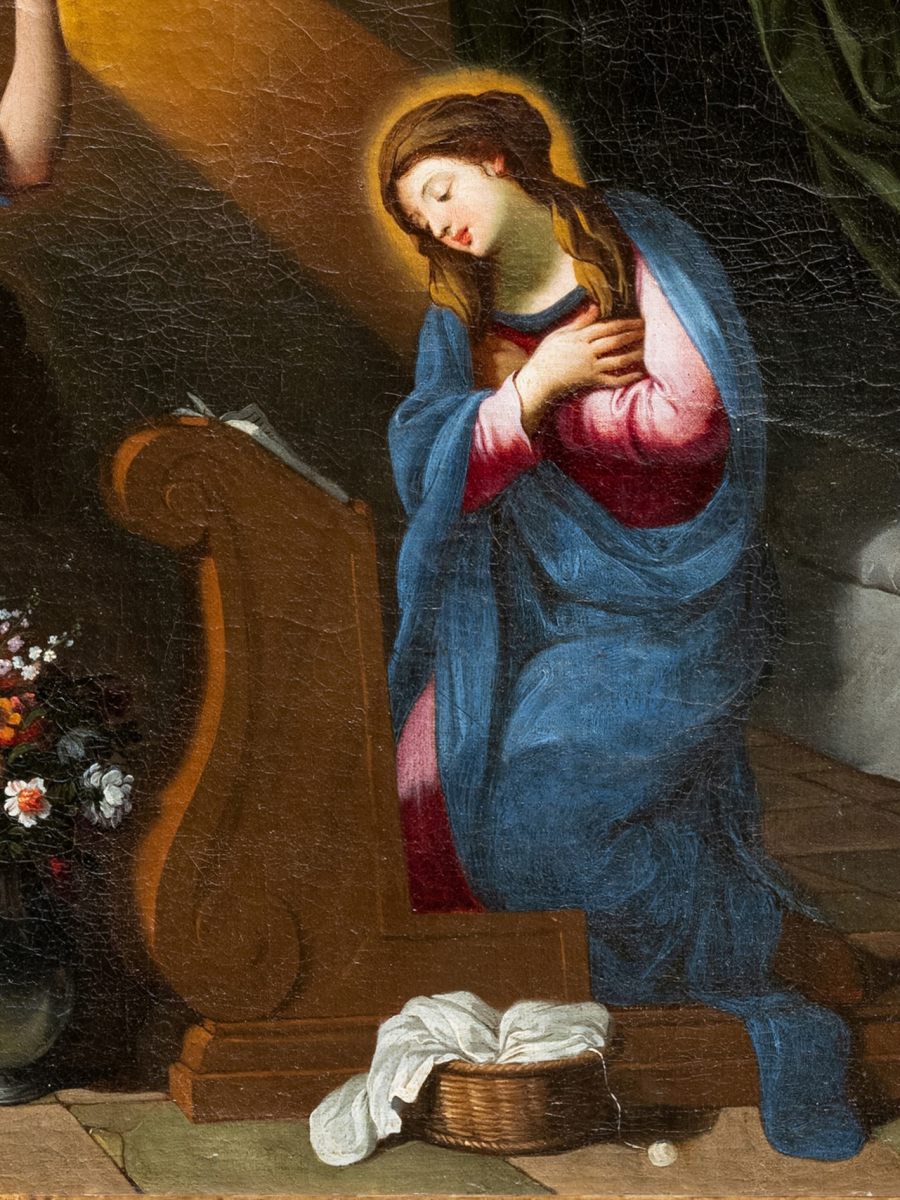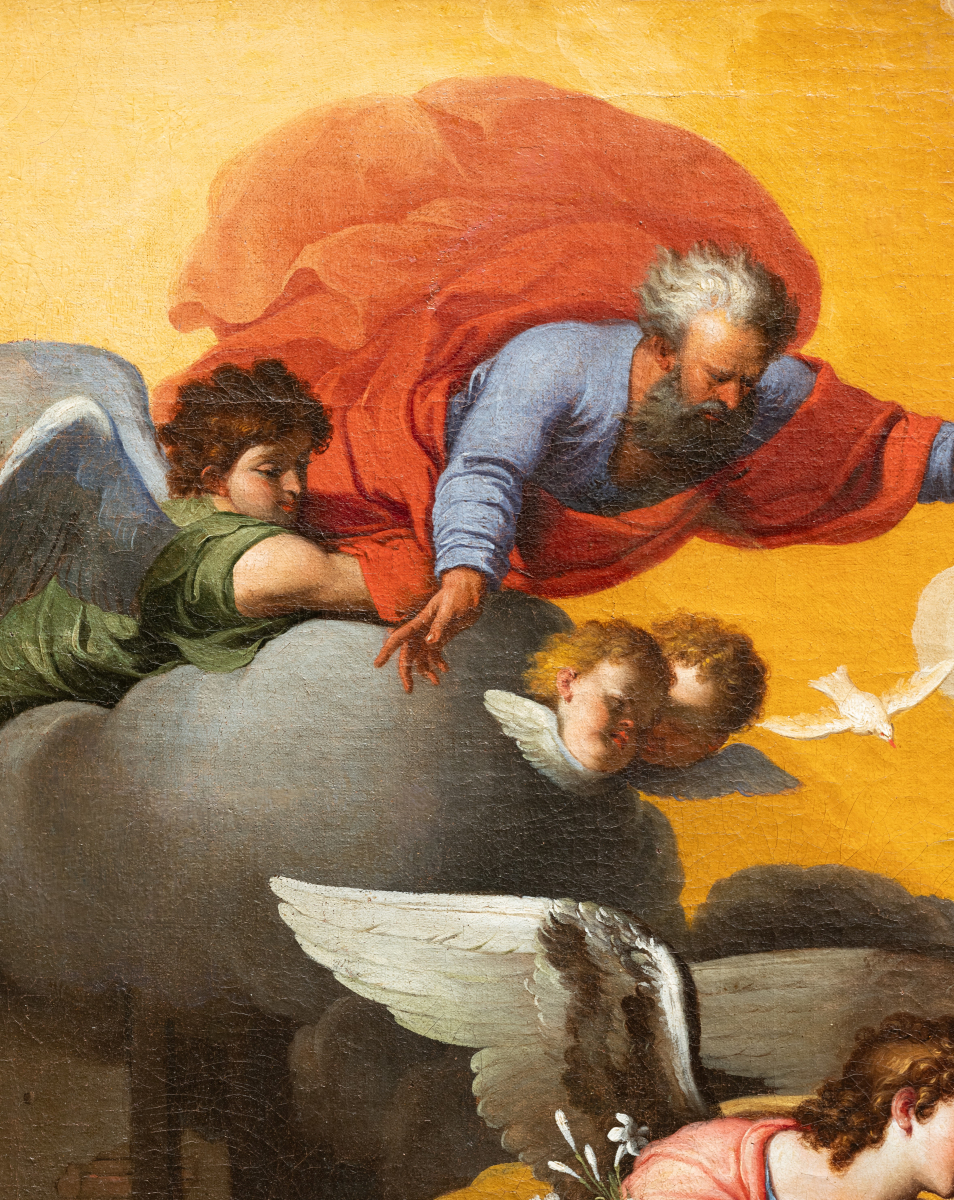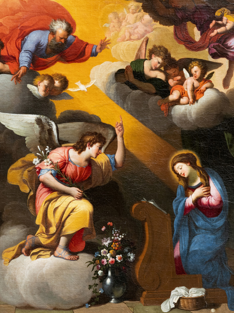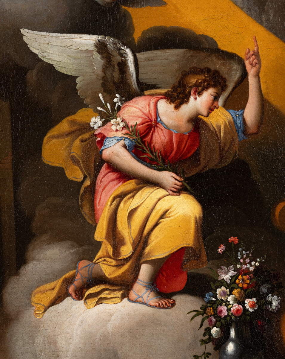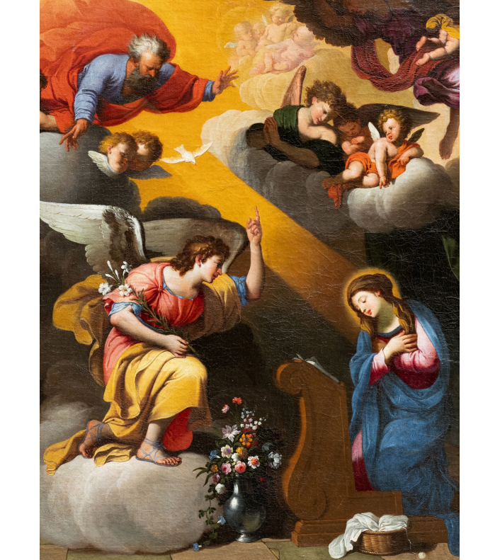 La figure ample de l’Archange Gabriel aux ailes déployées domine, grâce au nuage surélevé, Marie agenouillée sur son lutrin. L’assemblée céleste composée des chérubins accompagnés de Dieu le Père occupe quasiment tout l’espace du tableau, laissant peu de place à la Vierge, presque blottie dans son coin.