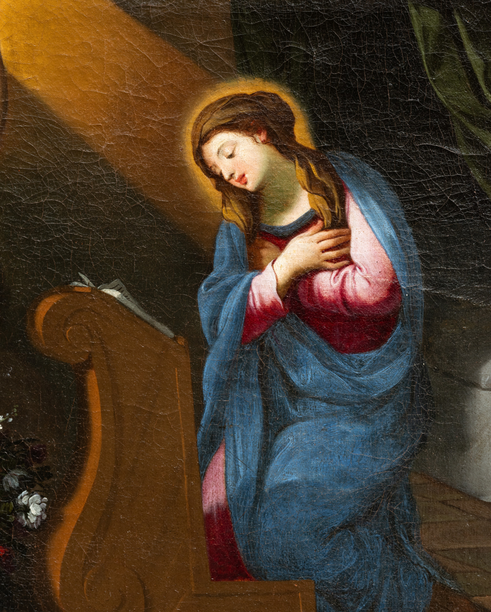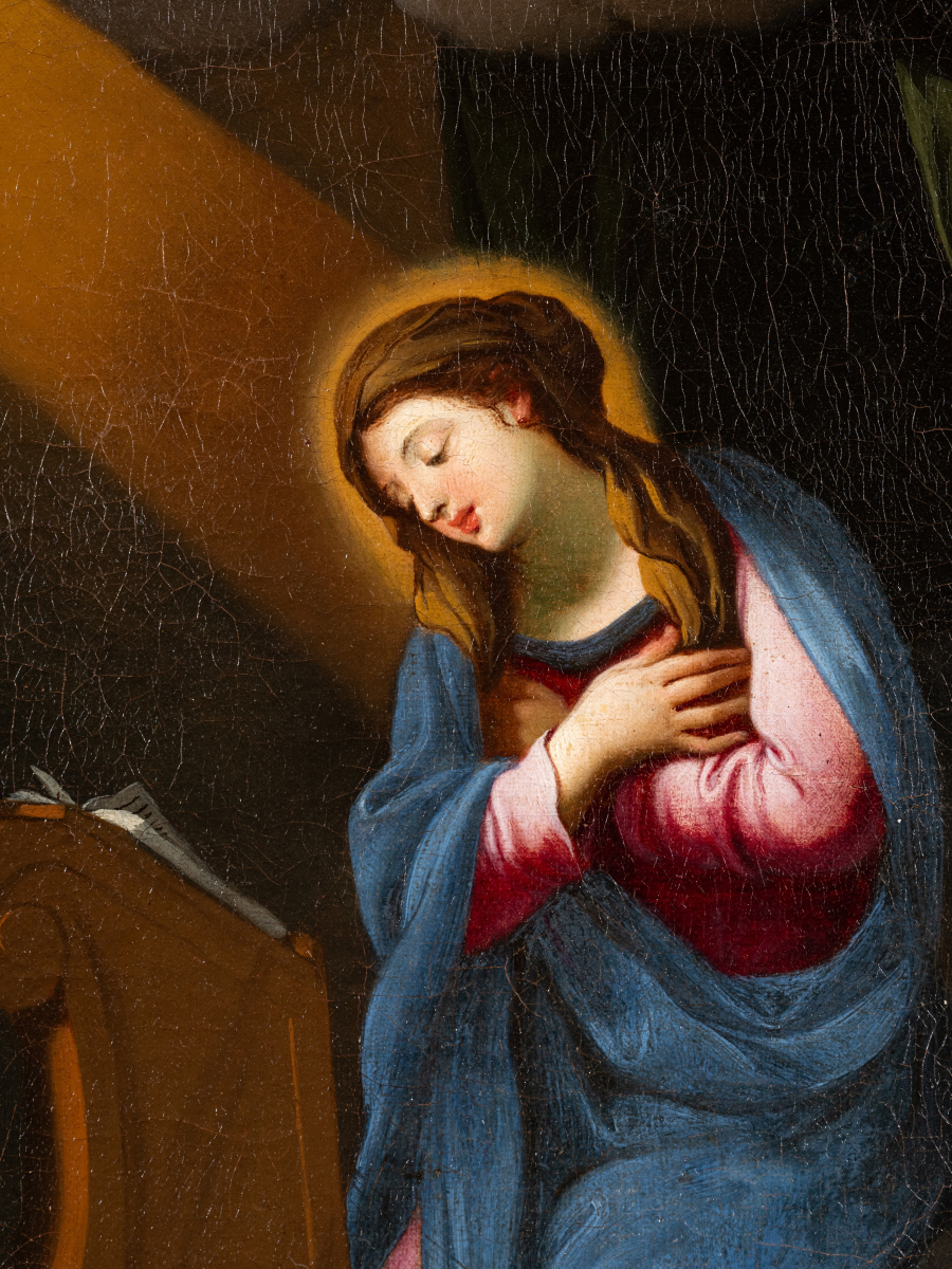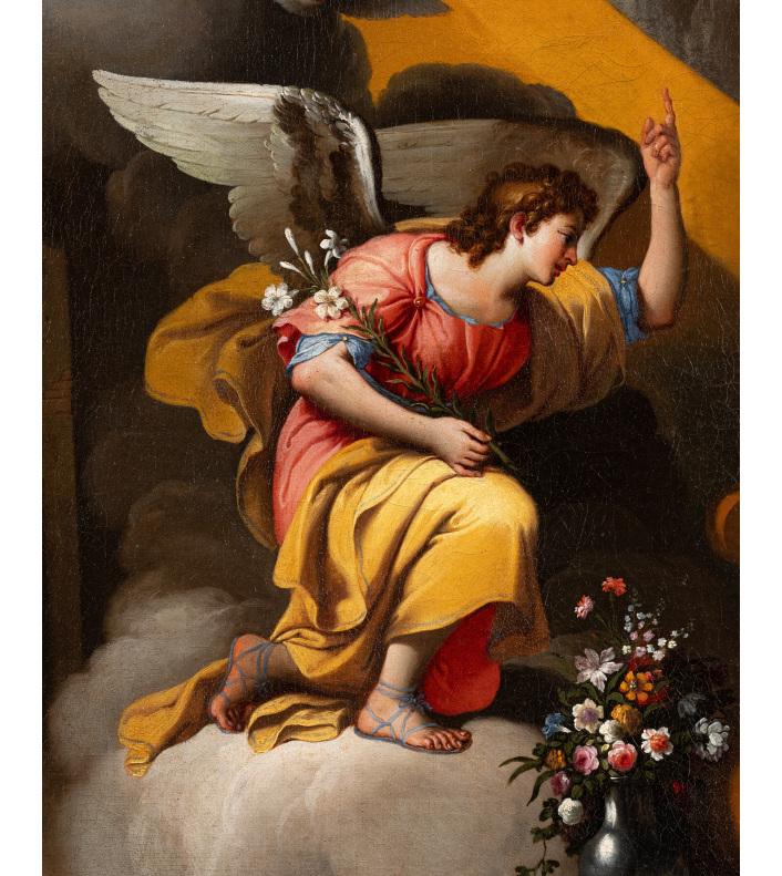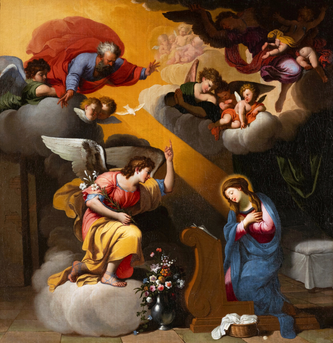 La figure ample de l’Archange Gabriel aux ailes déployées domine, grâce au nuage surélevé, Marie agenouillée sur son lutrin. L’assemblée céleste composée des chérubins accompagnés de Dieu le Père occupe quasiment tout l’espace du tableau, laissant peu de place à la Vierge, presque blottie dans son coin.