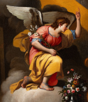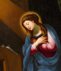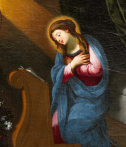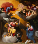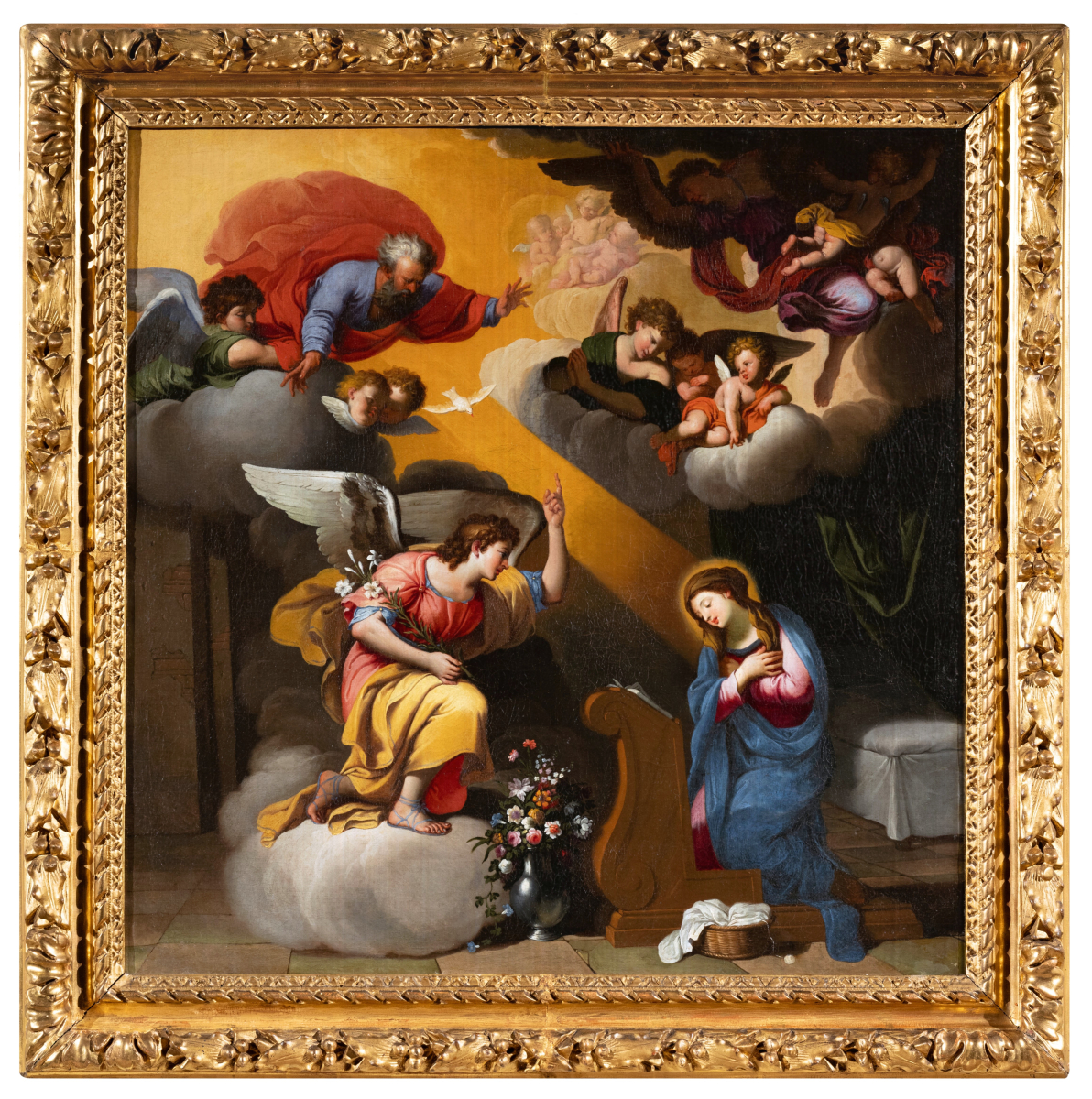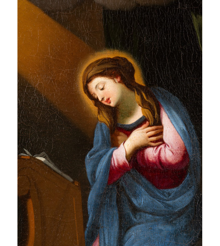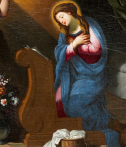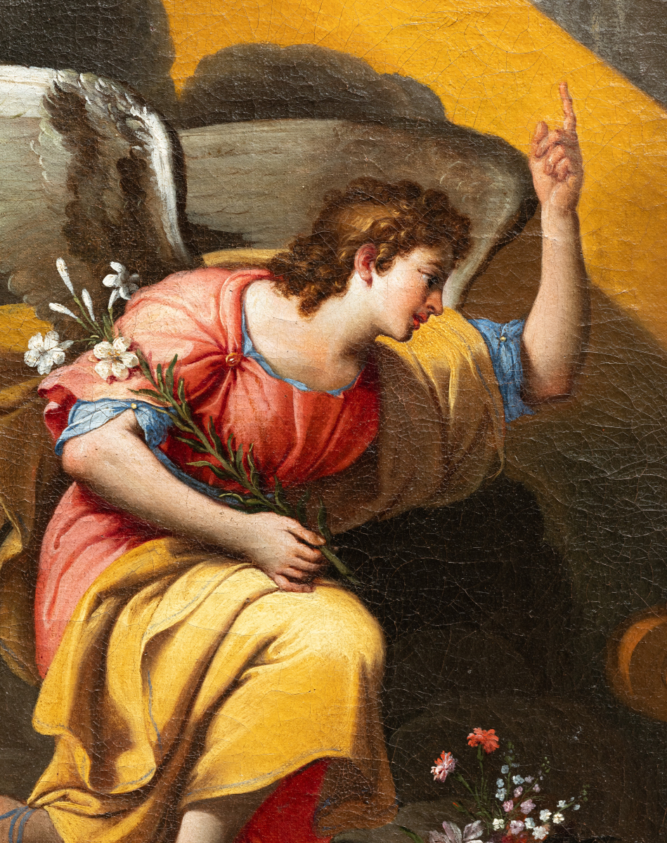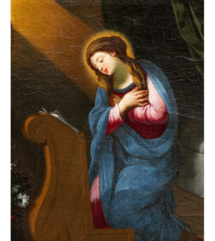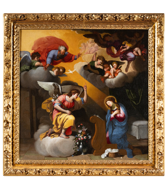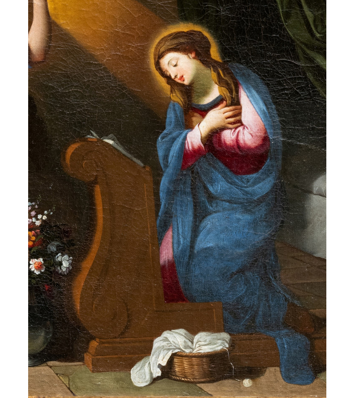 La figure ample de l’Archange Gabriel aux ailes déployées domine, grâce au nuage surélevé, Marie agenouillée sur son lutrin. L’assemblée céleste composée des chérubins accompagnés de Dieu le Père occupe quasiment tout l’espace du tableau, laissant peu de place à la Vierge, presque blottie dans son coin.