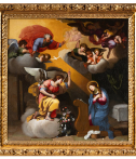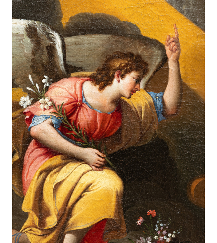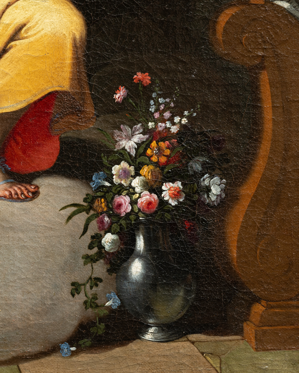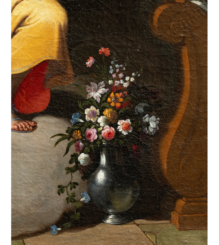 Cette belle composition est exécutée par un peintre, dont l'identité reste anonyme; l'excellent coloriste il exprime dans cette œuvre sa sensibilité artistique à la manière un peu suave, cependant son approche plastique des drapés et figures révèle un excellent savoir-faire et une mise en scène harmonieuse.