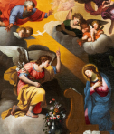 Dans cette magnifique composition illustrant la scène de l’annonciation la quiétude de la chambre de la vierge Marie se transforme en évènement glorieux suivant l’arrivée de l’archange Gabriel et de son escorte d’honneur.