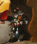 Le trait précis de l’artiste nous dans le souci du realisime nous détaille le vase aux multiples fleurs, réminiscent des nature mortes françaises du XVIIème siècle, à l’instar de celles par Jean Michel Picart ou François Habert.