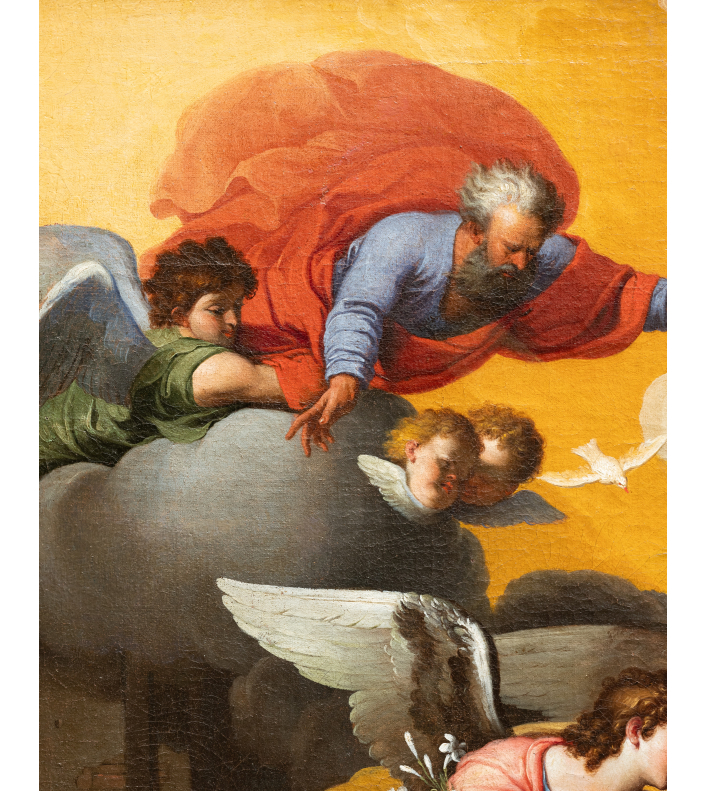 Tel un grand projecteur théâtral le rayon lumineux émanant de la poitrine du Dieu le Père converge vers la Vierge en dessinant un halo autour de sa tête.