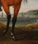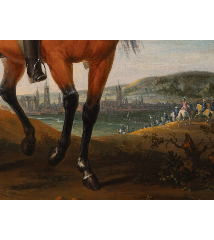 Obéissant aux règles de l’iconographie belliqueuse, notre portrait présente le monarque en cavalier émérite devant la ville assiégée de Mons.
