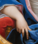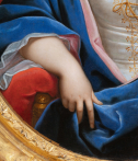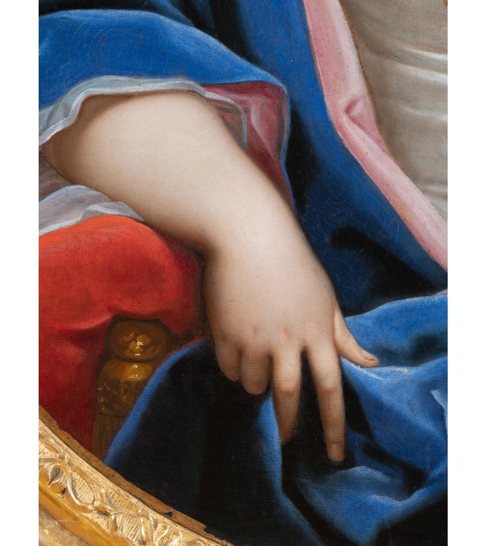 Elle retient élégamment de sa main droite le pan du manteau, le bras droit s'appuyant sur un coussin de velours rouge posé sur l'accoudoir.