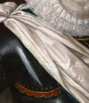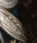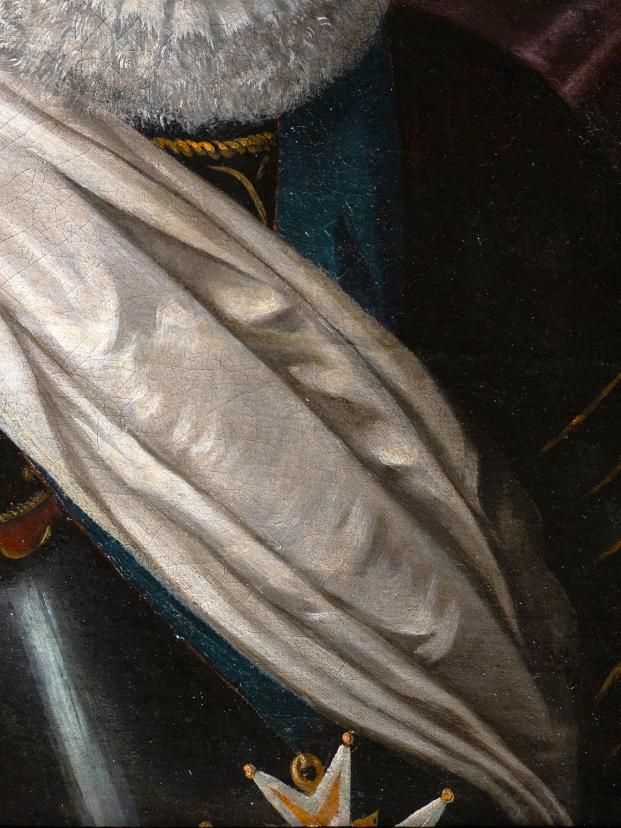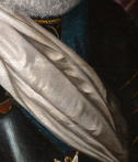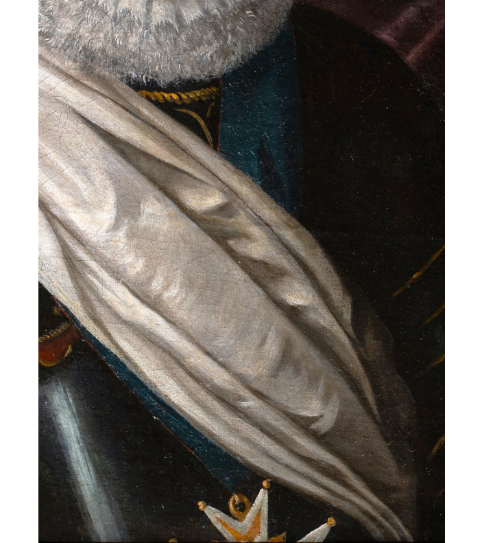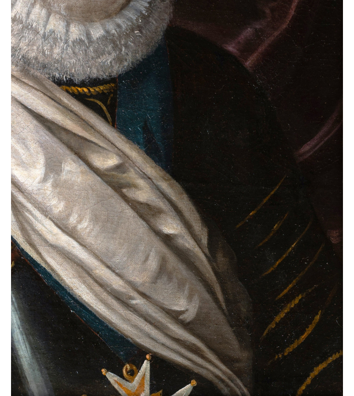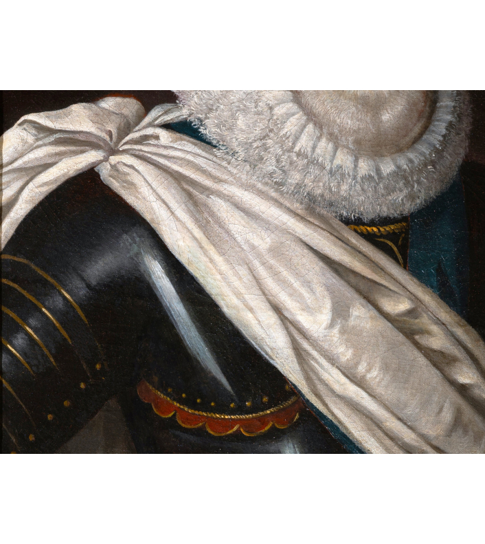 Entièrement vêtu d’une armure noire, soigneusement polie, les reflets captent la lumière et structurent le buste du roi. Rehaussée de fins ornements dorés, elle dépasse sa fonction militaire pour devenir un véritable attribut de représentation : elle évoque la bravoure du chef de guerre tout en magnifiant sa présence. Drapé sur l’épaule, l’écharpe blanche chargée de signification vient adoucir cet ensemble métallique et introduire un contraste de textures, tandis que la large fraise blanche encadre le visage et attire l’attention sur les traits du souverain, traités avec une grande finesse.