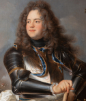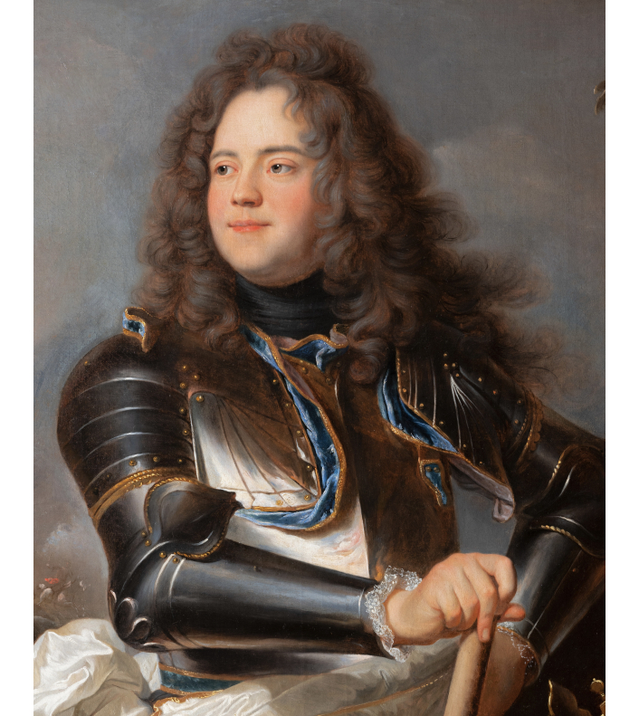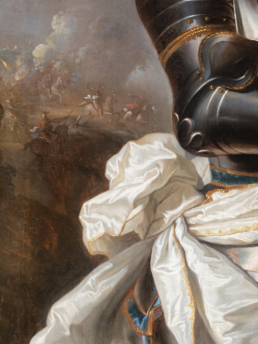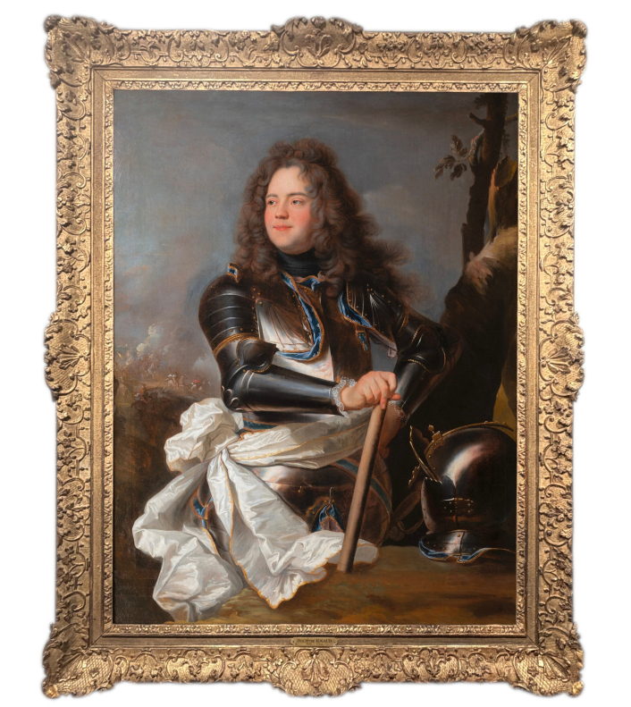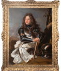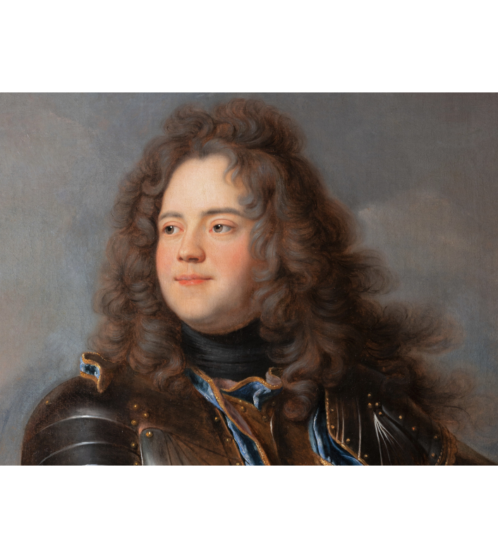 Notre majestueux portrait issu de l'atelier de Hyacinthe Rigaud représente Henri-Louis de La Tour d’Auvergne (1679-1753), comte d’Évreux, membre d’une des plus prestigieuses familles de la noblesse française. A la fois un instrument de représentation du pouvoir et du prestige nobiliaire, notre œuvre s’inscrit dans la tradition du portrait d’apparat militaire visant à magnifier la position sociale et la ferveur belliqueuse des membres de l’aristocratie par une mise en scène élaborée associant richesse des costumes, gestes codifiés et effets lumineux spectaculaires.