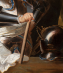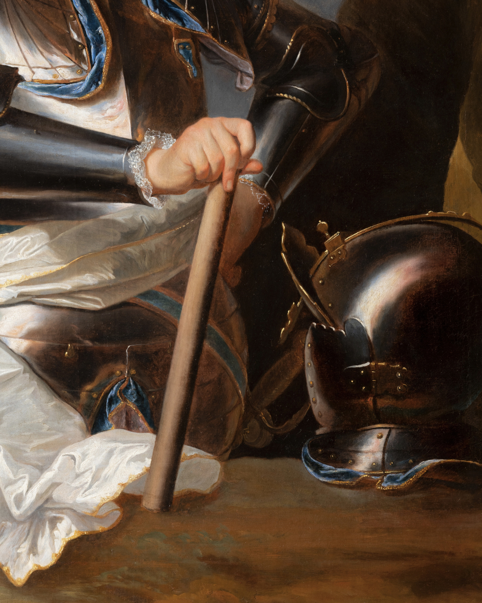 La tête est tournée vers la gauche. Une grande perruque brune tombe en larges boucles sur ses épaules, encadrant un visage juvénile aux joues pleines. Les lèvres fines esquissent un sourire discret tandis que l’expression générale demeure douce et bienveillante, contraste subtil avec l’iconographie guerrière. L’attitude du modèle traduit néanmoins assurance et dignité : la main droite repose sur un bâton de commandement placé au premier plan, attribut symbolique de l’autorité militaire, tandis que le bras gauche est replié, la main posée sur la hanche dans une pose à la fois élégante et affirmée.