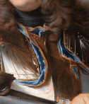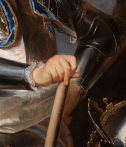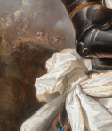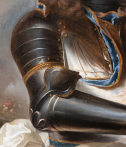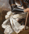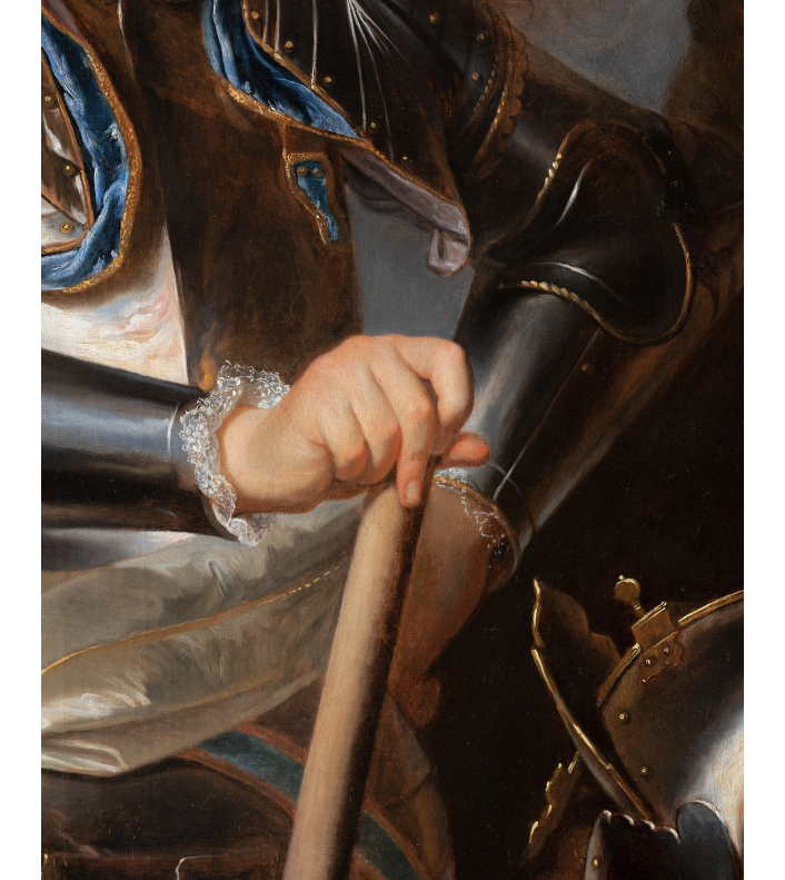 Le comte est entièrement cuirassé. L’armure, rendue avec un soin particulier dans le traitement des reflets métalliques, est sobrement ornée de parements de velours bleu visibles aux jonctions des pièces d’armure. Aux poignets apparaissent les manches d’une fine dentelle blanche qui adoucissent la rigidité du métal. Une épée est attachée à la taille par un porte-épée du même velours bleu. Autour de la taille, une écharpe blanche de commandement forme un nœud sculptural ; ses drapés, composés de plis anguleux et dynamiques, animent la composition.