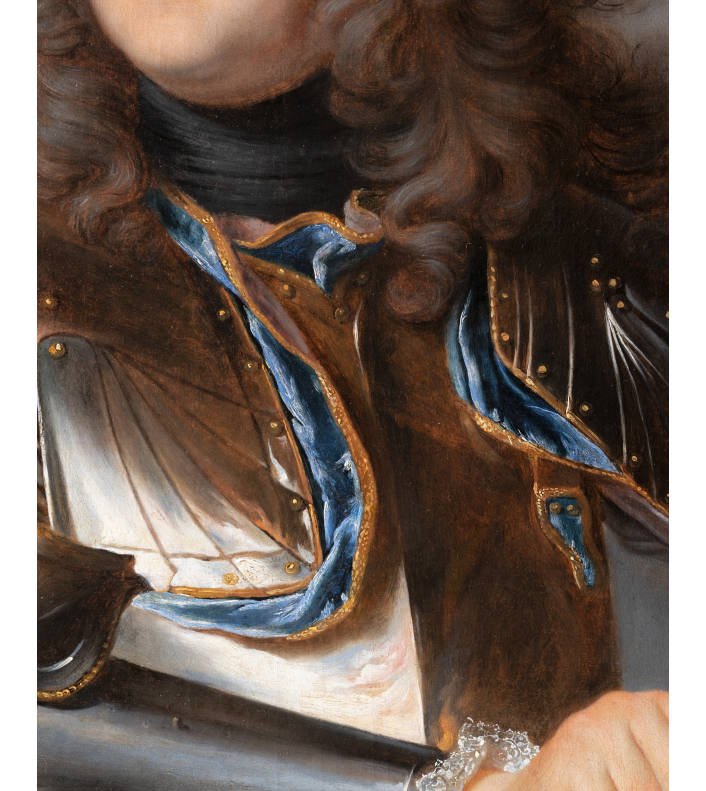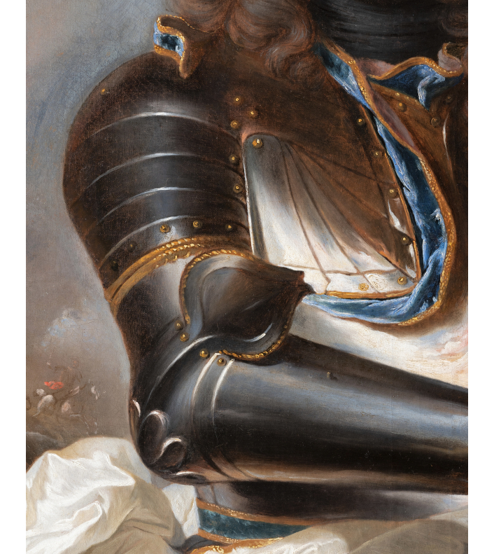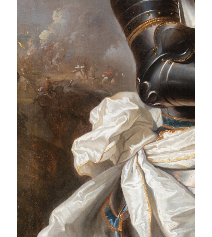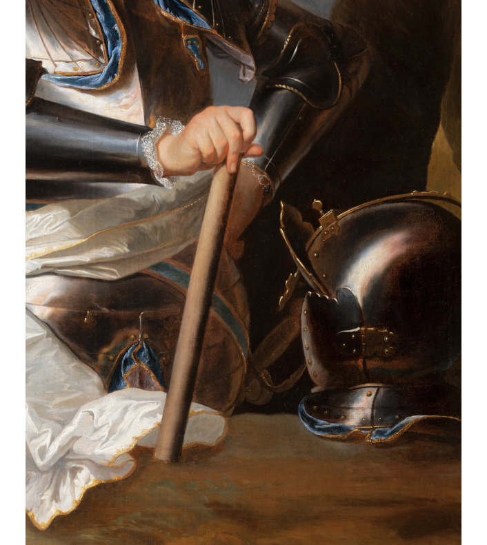 L’éclairage, volontairement théâtral, illumine abondamment le visage du modèle et crée de puissants reflets sur la surface polie de l’armure. Malgré la posture relativement statique du personnage, les drapés flottants de l’écharpe blanche introduisent un mouvement qui confère à l’ensemble dynamisme et vigueur. De cette mise en scène émane une impression de puissance et de charisme : par sa stature, son port de tête et son attitude, le jeune comte apparaît comme l’incarnation idéale du noble guerrier au début du XVIIIème siècle.