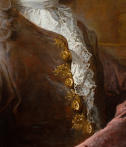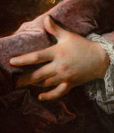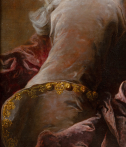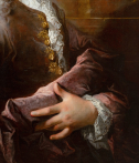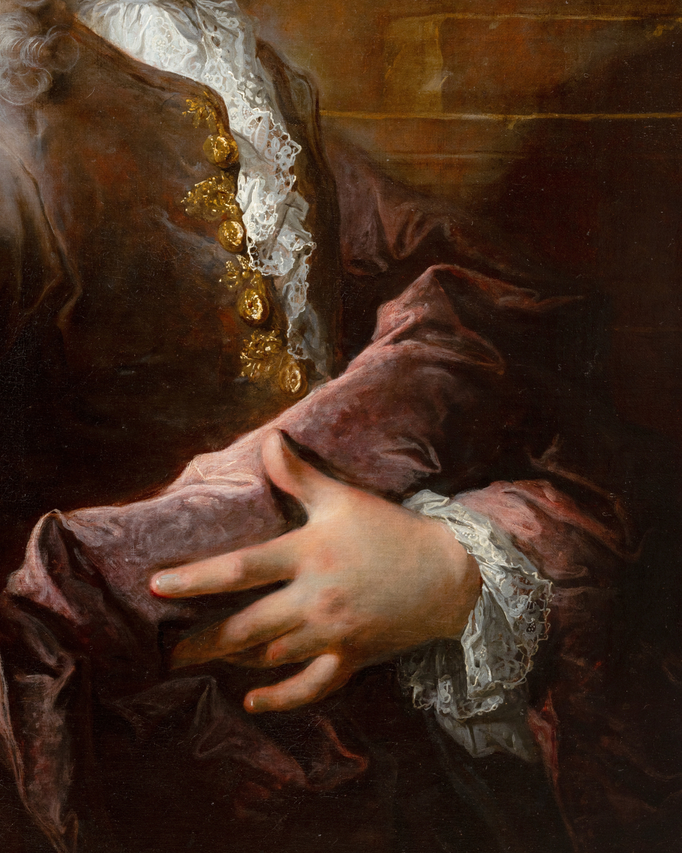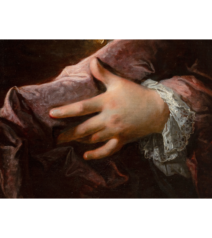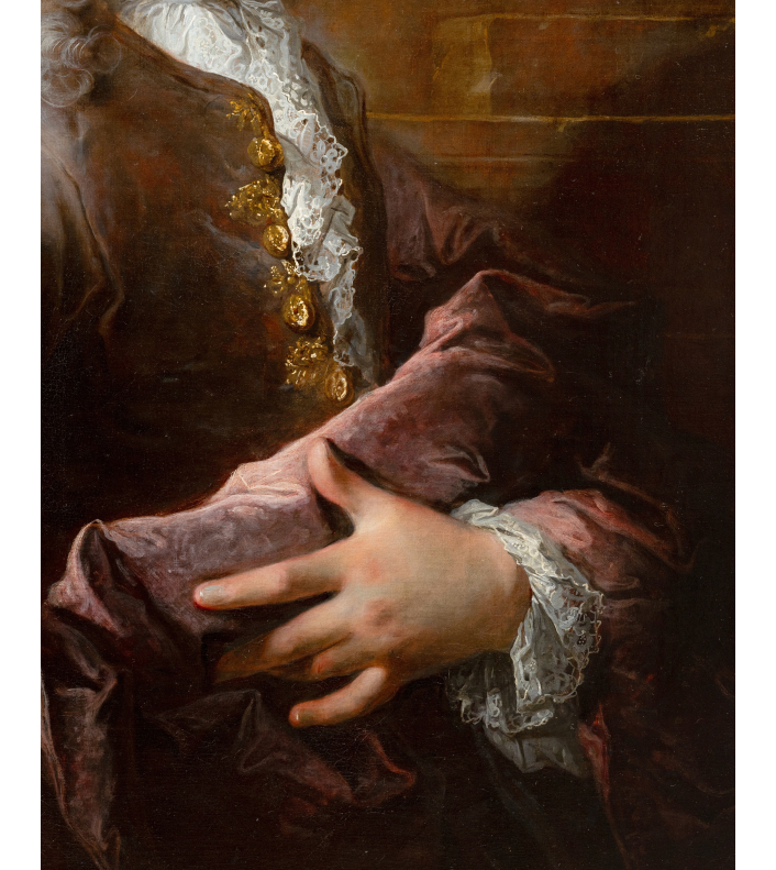 La main qui retient le manteau, fait l’objet d’un soin particulier. Les doigts souples et longs, à l’auriculaire légèrement écarté témoignent d’un idéal de distinction et de raffinement aristocratique. Les ongles, lisses et délicatement brillants, signalent une pureté et participent à la codification sociale du portrait. Le geste très maniéré introduit une tension discrète et contrôlée, relevant d’un vocabulaire gestuel codifié propre au portrait d’apparat.